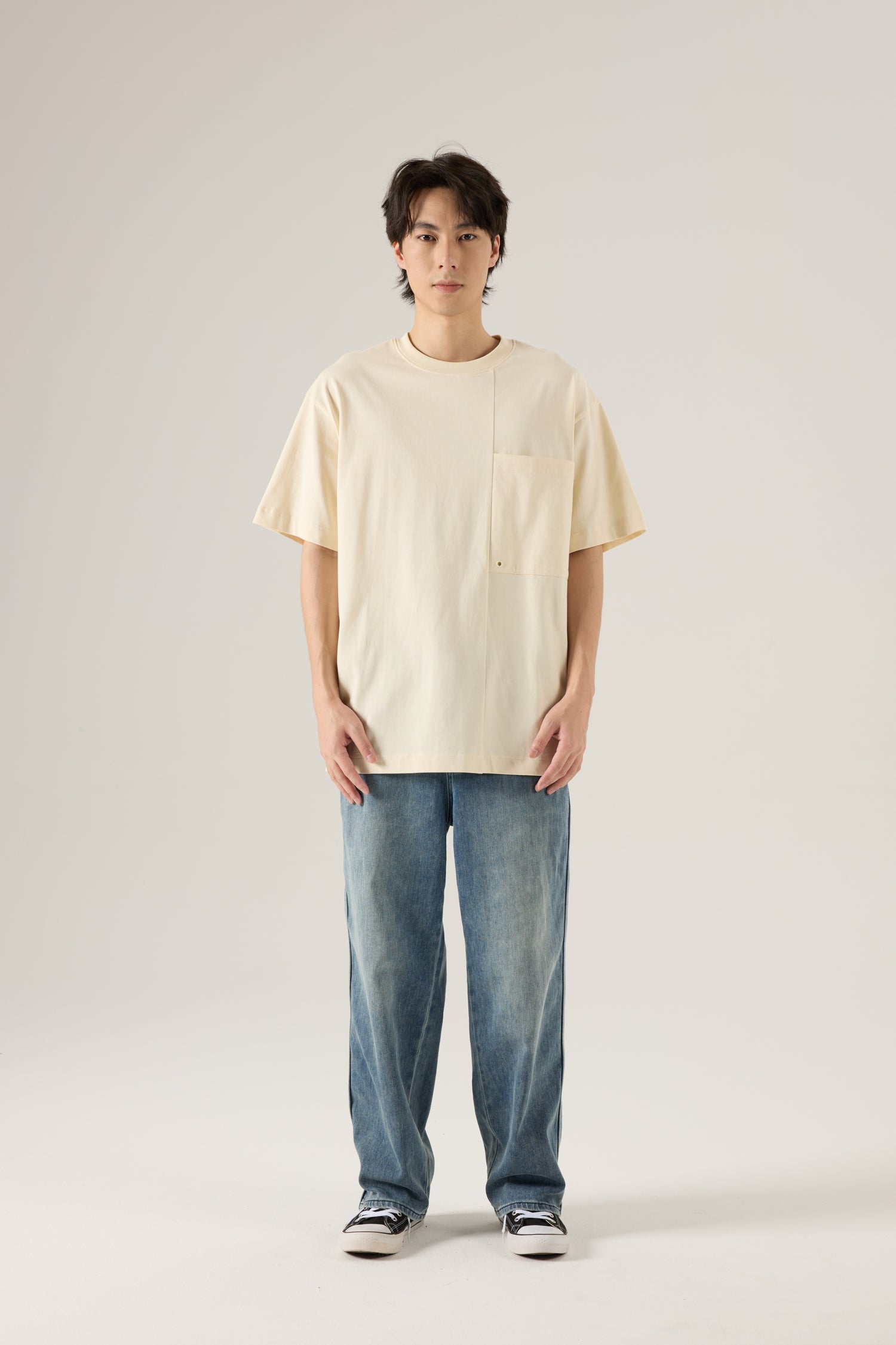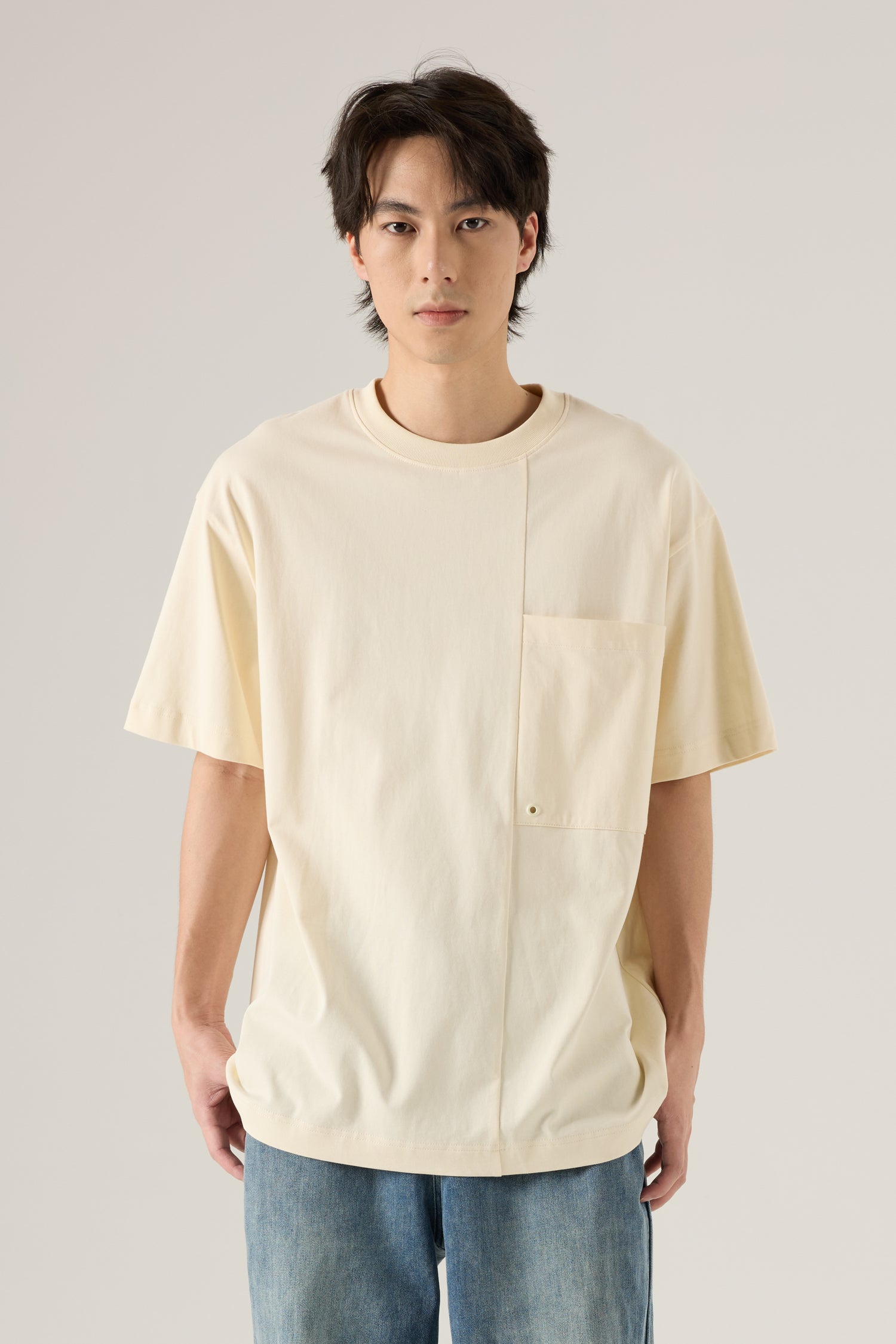 Made from soft cotton jersey, this tee features an oversized cut with subtle panel detailing and a functional chest pocket. Easy to wear on its own and pairs effortlessly with denim or casual bottoms.
