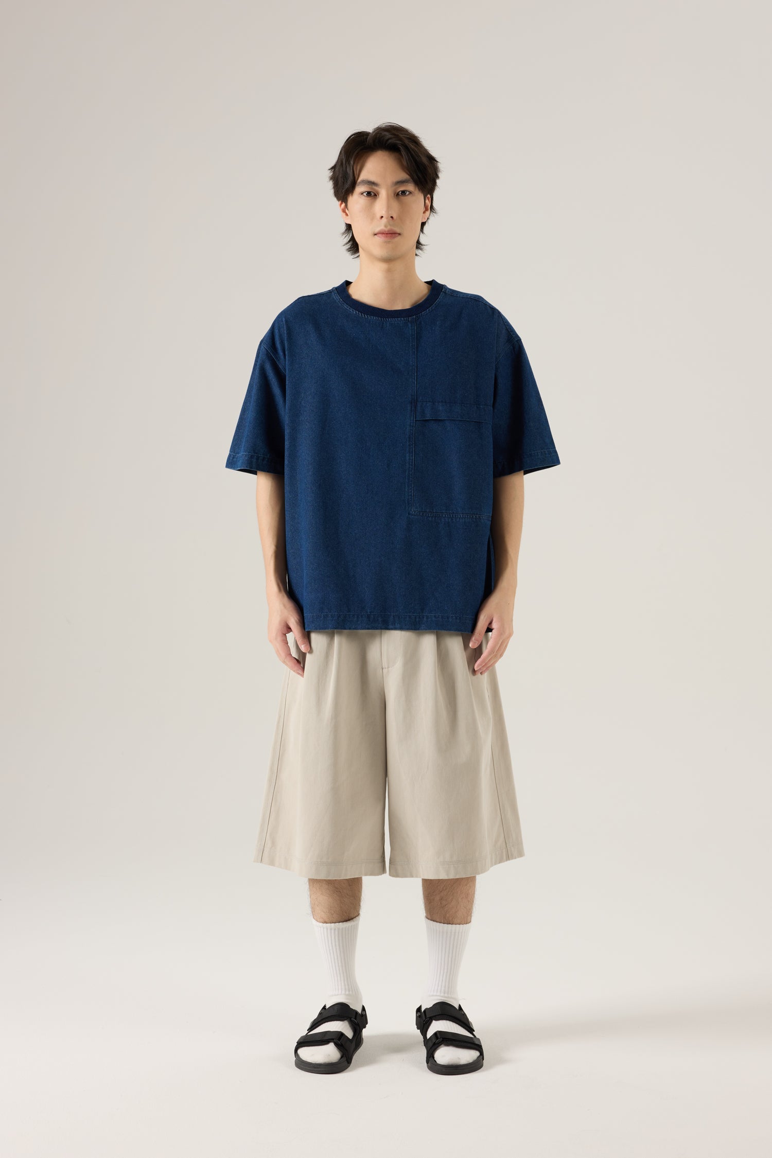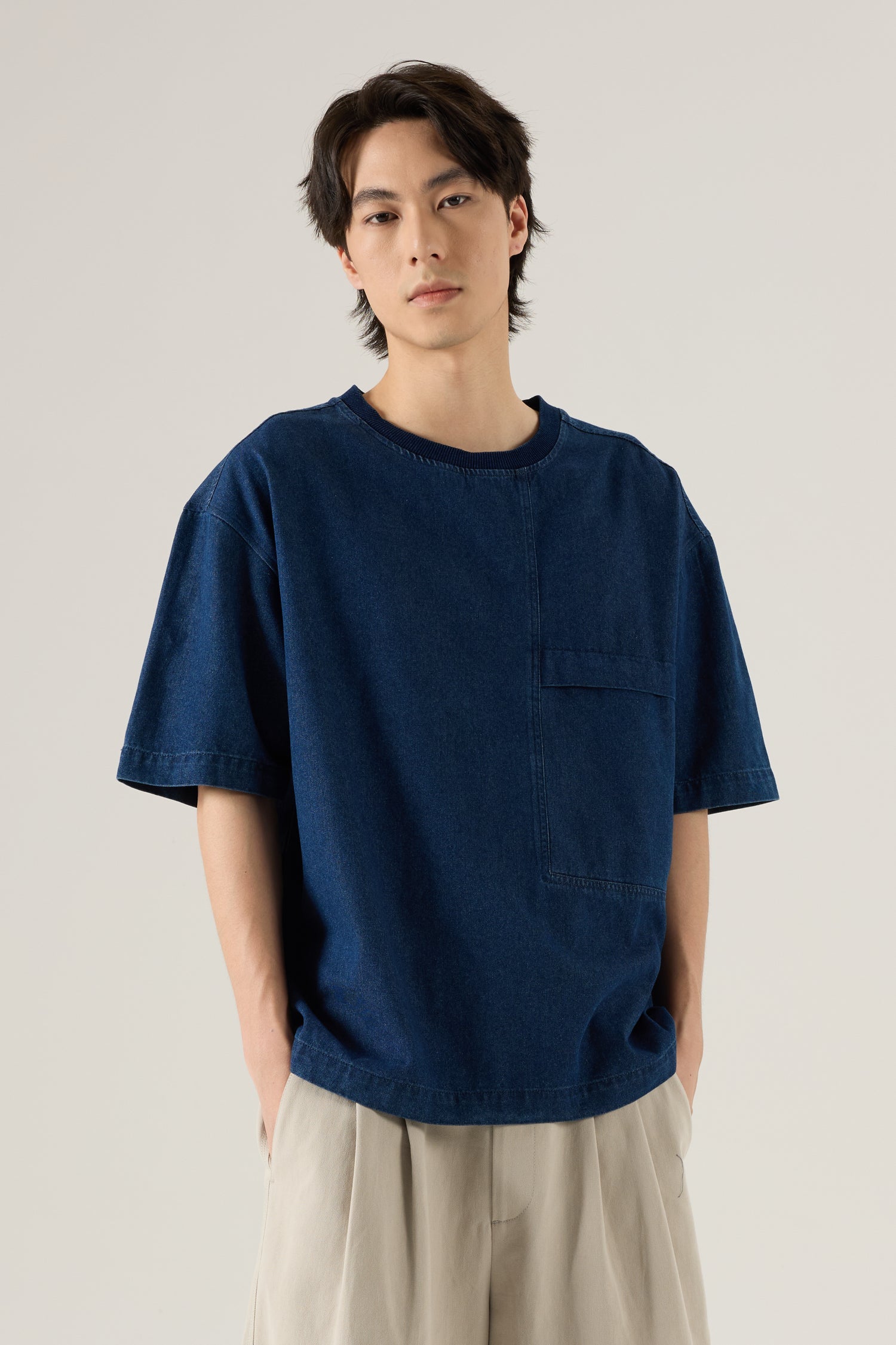Designed in an oversized fit, this denim tee features a ribbed crew neckline and a front panel detail with a flap pocket. The structured fabric adds a subtle utility touch while keeping the look casual and versatile.