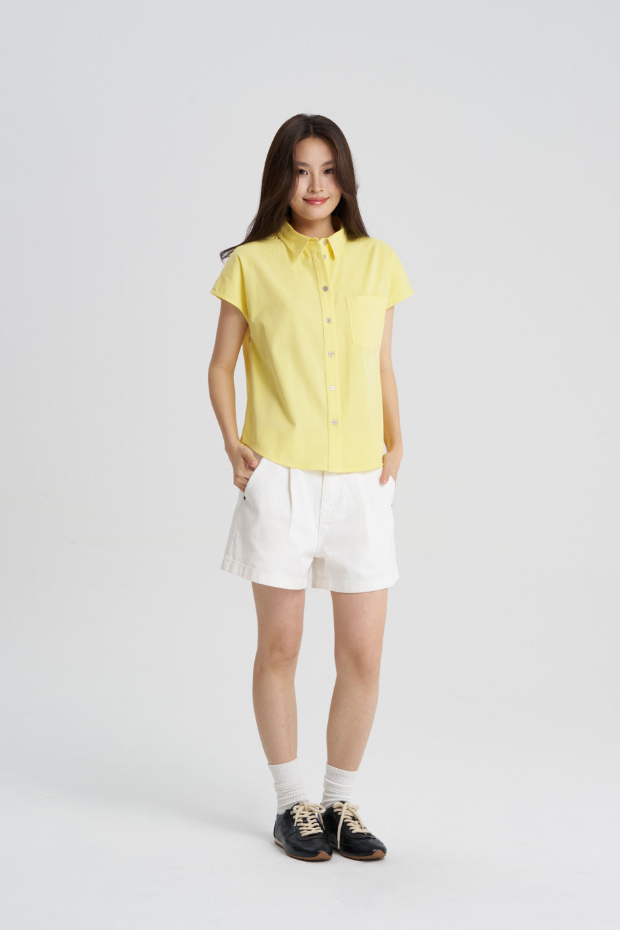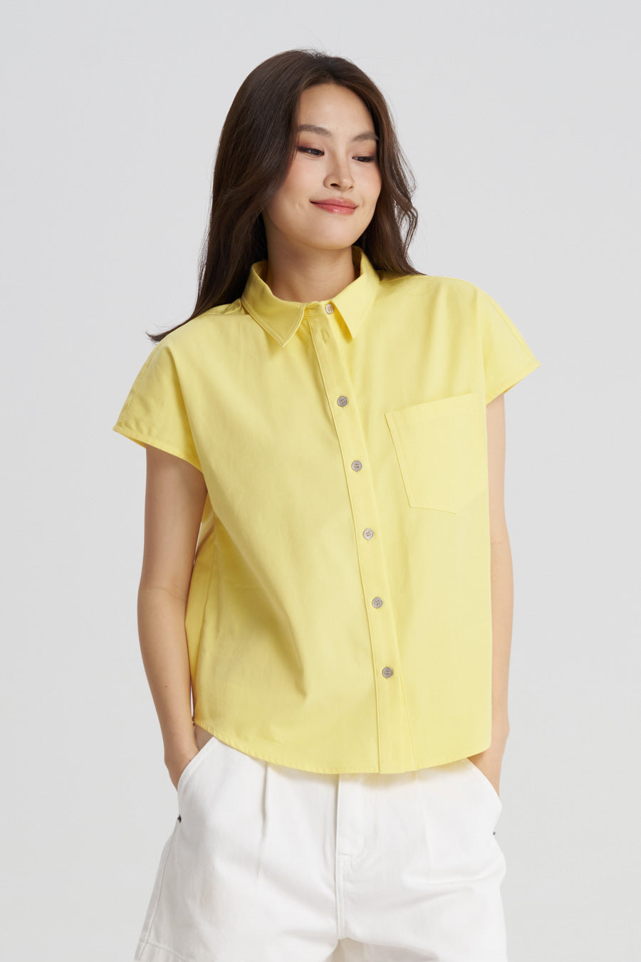 Designed with a modern edge, this blouse combines ease with polish in a clean silhouette and structured neckline. Fronted with metallic buttons, it adds a subtle touch of shine that elevates the minimalist style. Designed for casual wear, it pairs effortlessly with jeans, shorts, or relaxed skirts, making it an easy go-to piece for laid-back days.