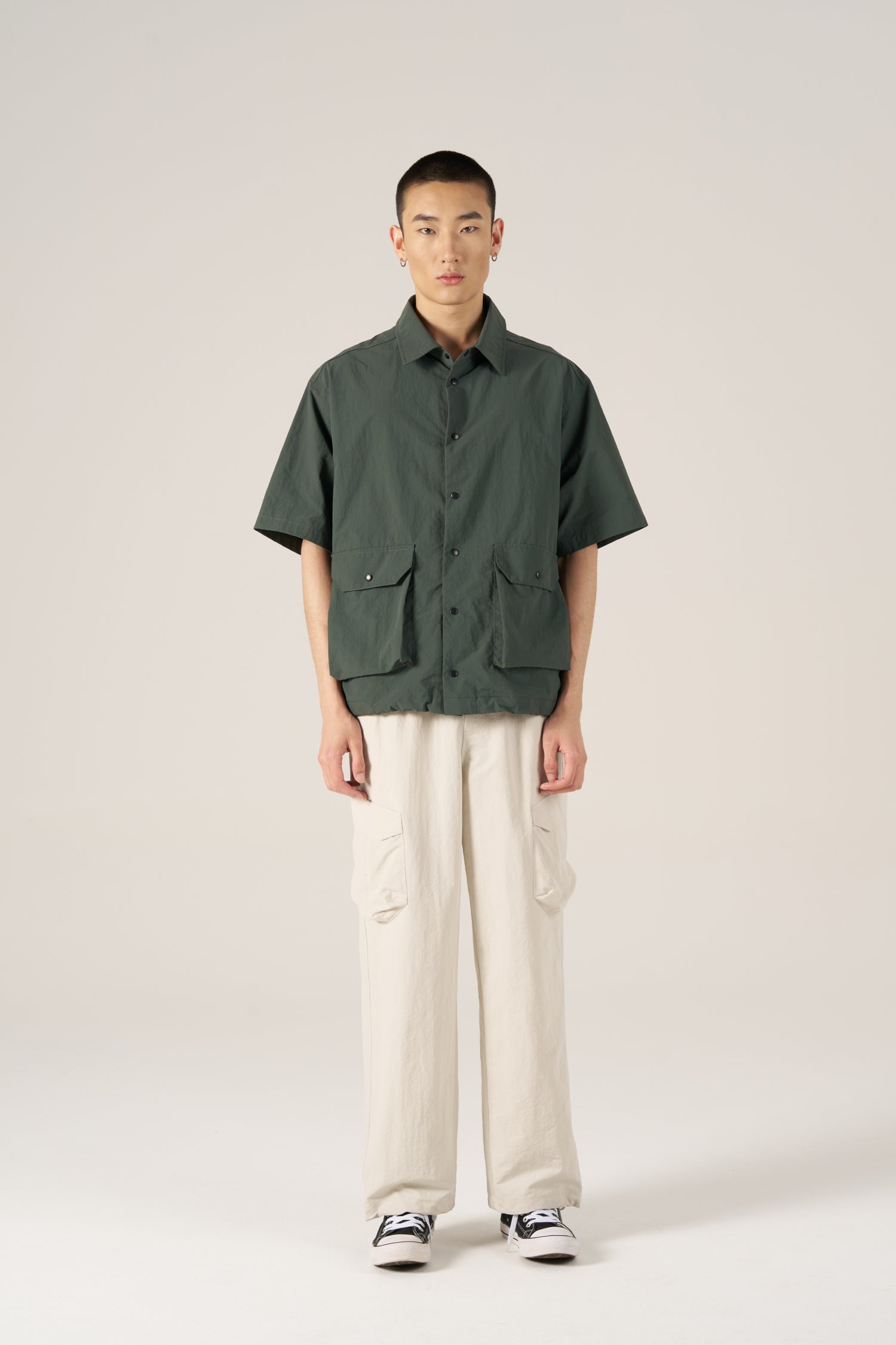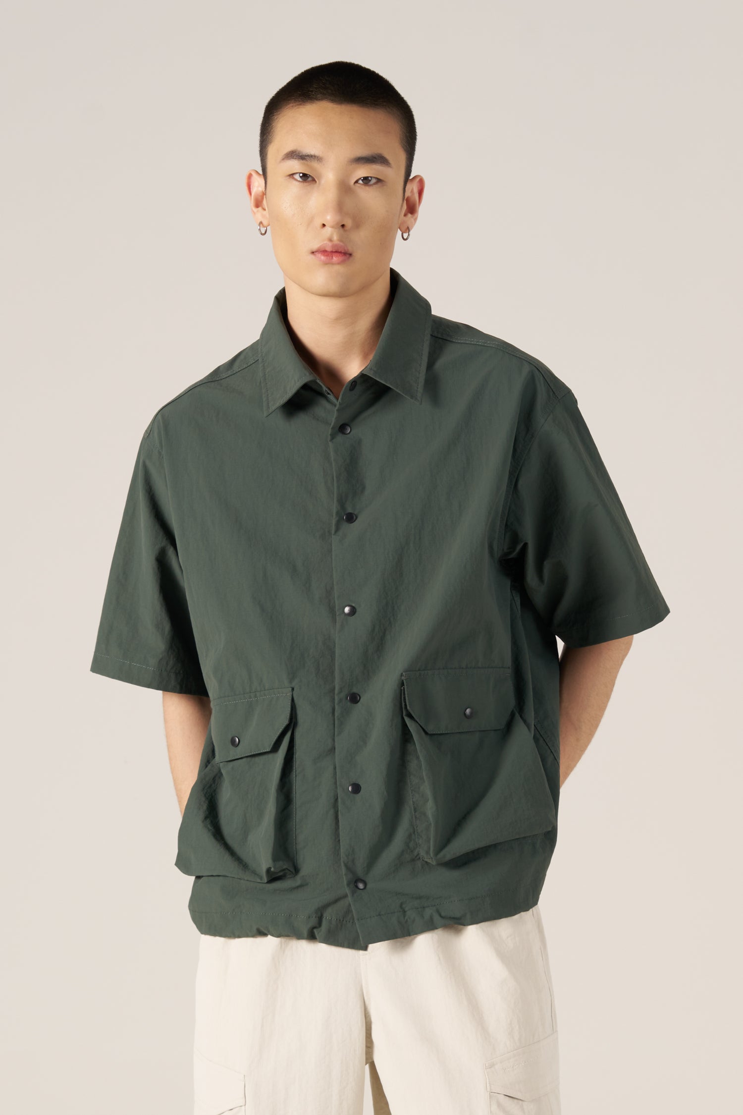 A modern shirt in lightweight nylon with a crisp, structured feel. Features a relaxed silhouette, snap buttons, and roomy flap pockets—easy to layer and style.