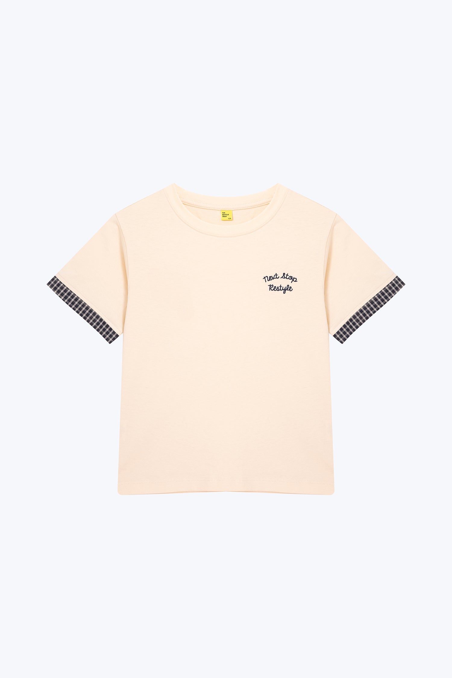 A fun and stylish kids’ tee with contrast checkered sleeve cuffs and playful chest detail, designed for all-day comfort and a trendy everyday look.