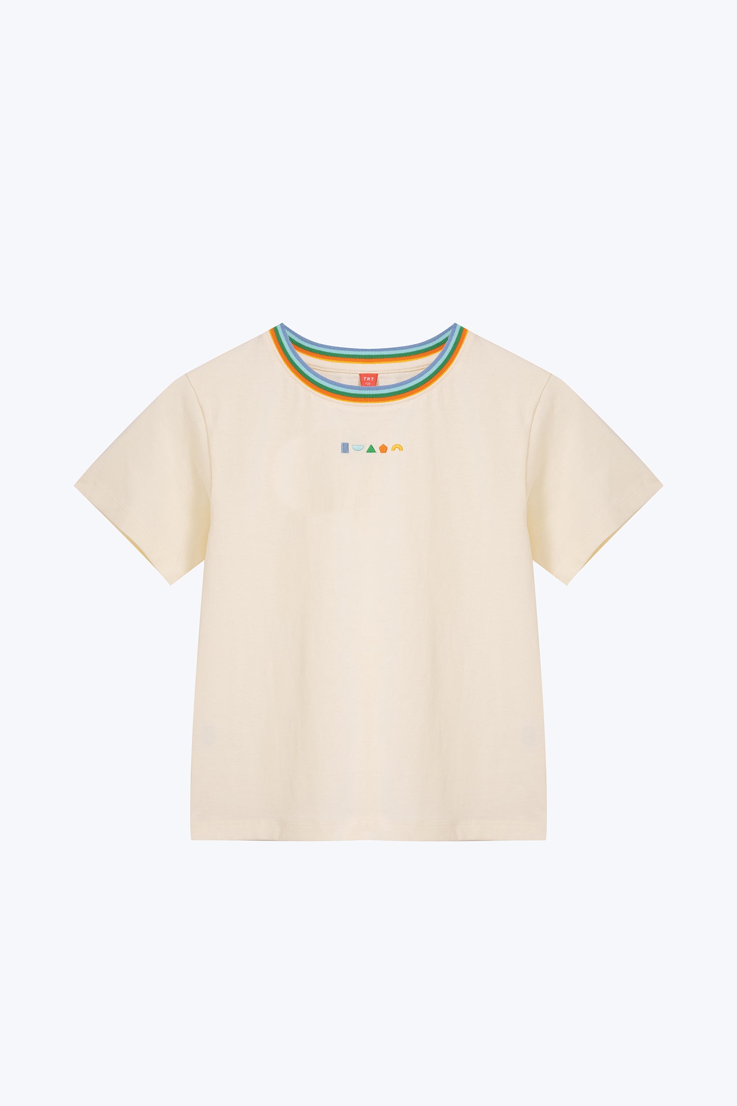 A cheerful tee with contrast blue pocket and playful multicolour embroidery at the back. Bright, comfy, and full of everyday fun.