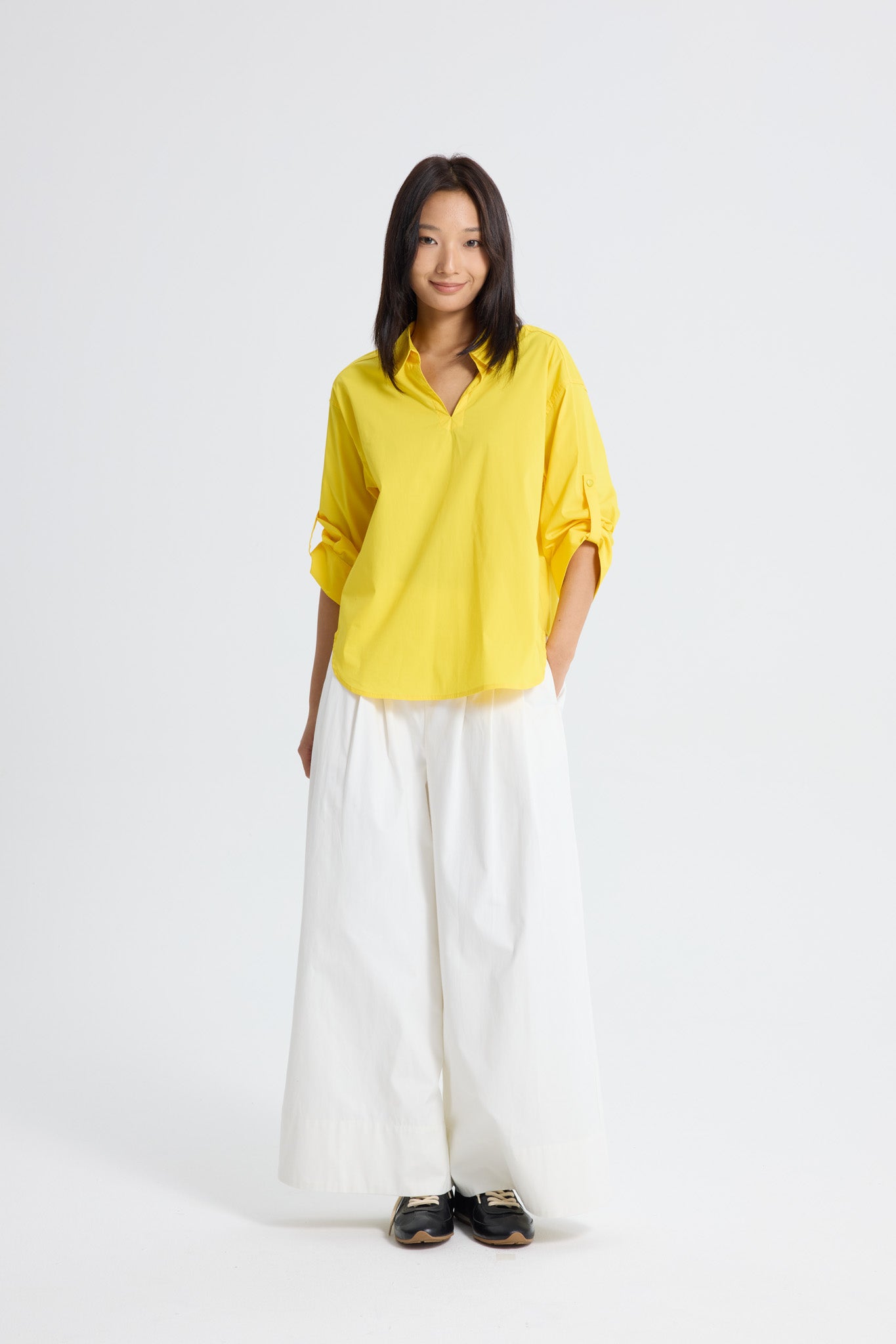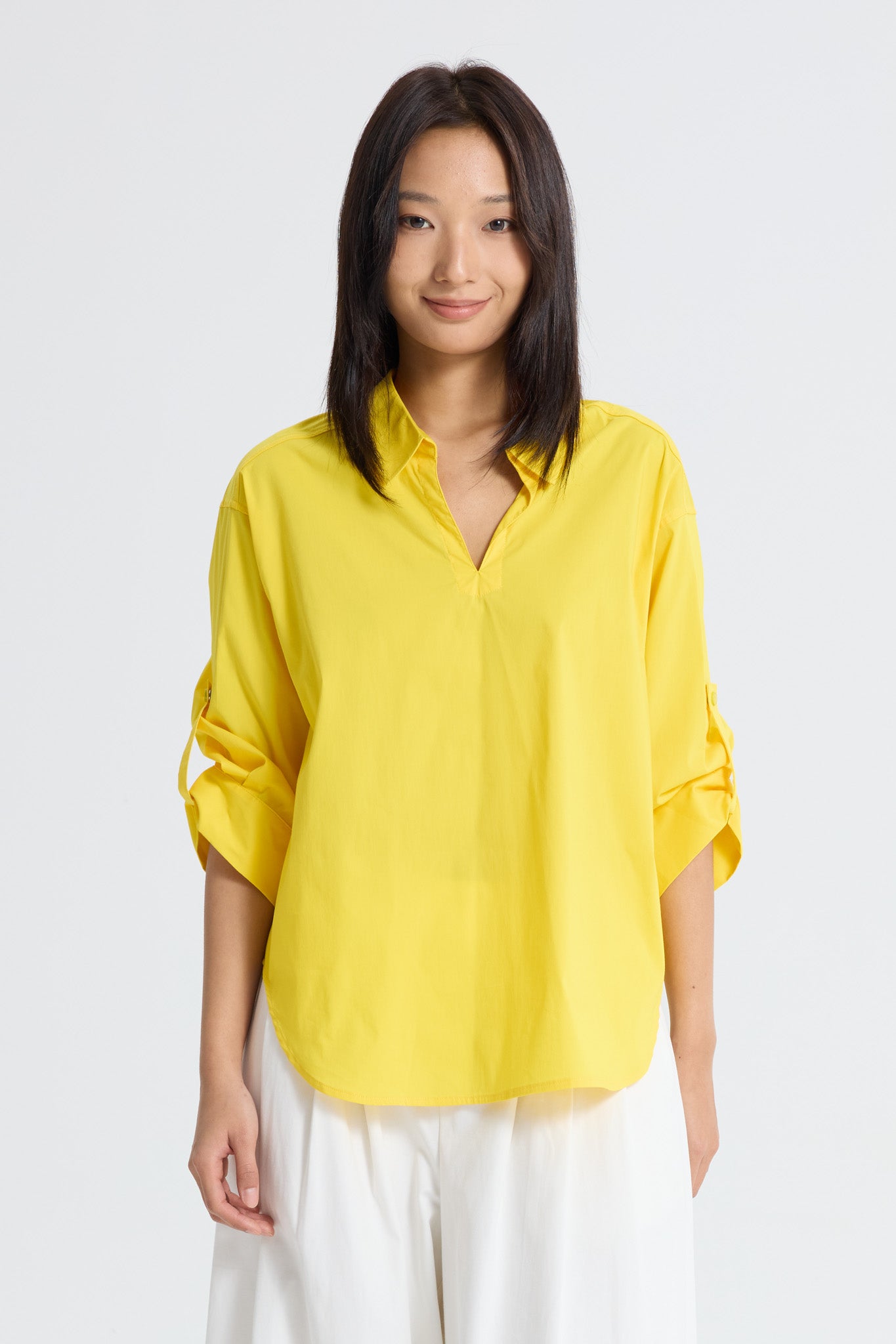 Find all day comfort in a relaxed, loose silhouette made from cotton-blend material that’s gentle on the skin. Enjoy the breathable properties with its sleeves let down or rolled up with sleeve tabs. Looks equally as good worn loose with its curved hem or tucked in.