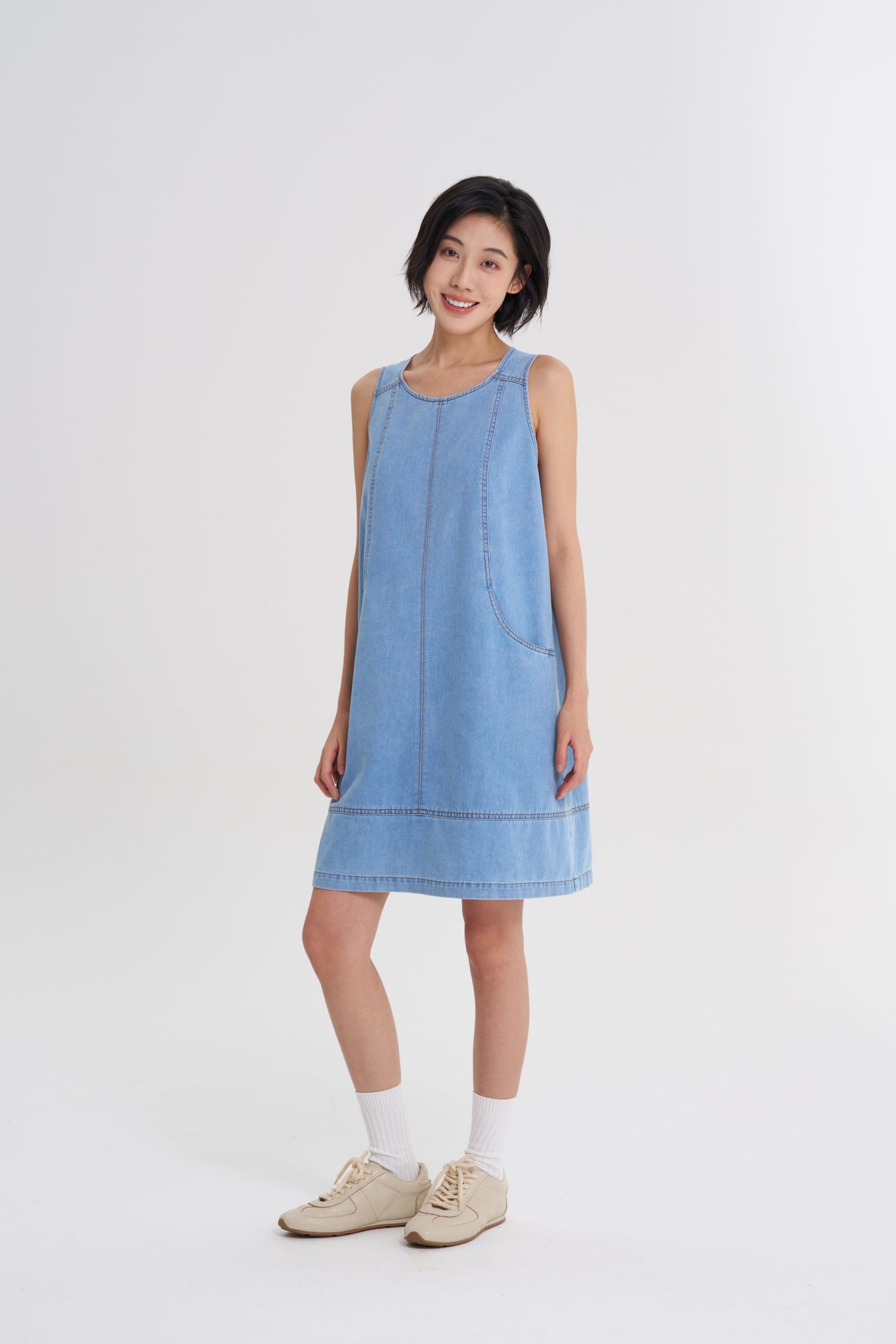 A sleeveless denim seamline dress designed with a clean silhouette for easy everyday wear. Featuring a round neckline and panel seam details that contour the shape, it adds visual interest while keeping the look understated. Functional side pockets are seamlessly integrated into the design, enhancing practicality without compromising style. Finished with a straight hem and back zip closure, this versatile piece can be styled on its own or layered for a laid-back yet polished look.