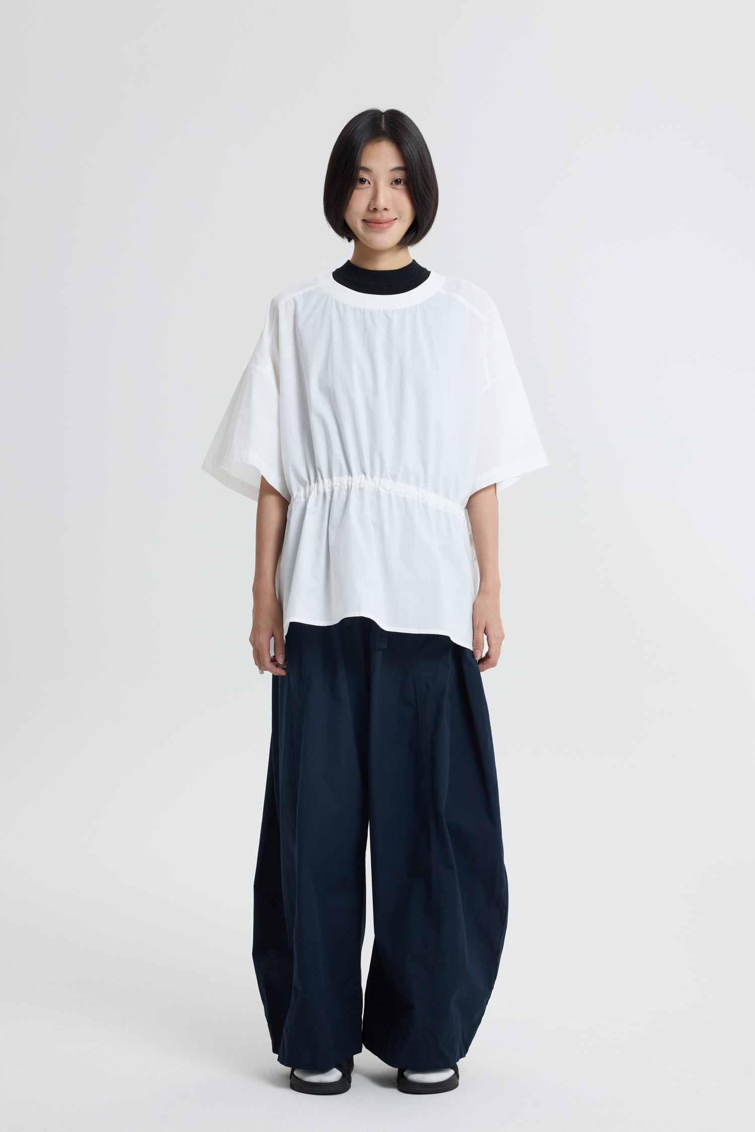 A modern update to a casual staple, this short sleeve tee features a softly structured silhouette with a functional drawstring waist that cinches gently for a flattering fit. Crafted from smooth, breathable fabric, it offers all day comfort with a touch of polish. The adjustable waist allows for versatile styling, wear it relaxed or gathered to accentuate the waist. An effortlessly chic piece perfect for everyday refinement.