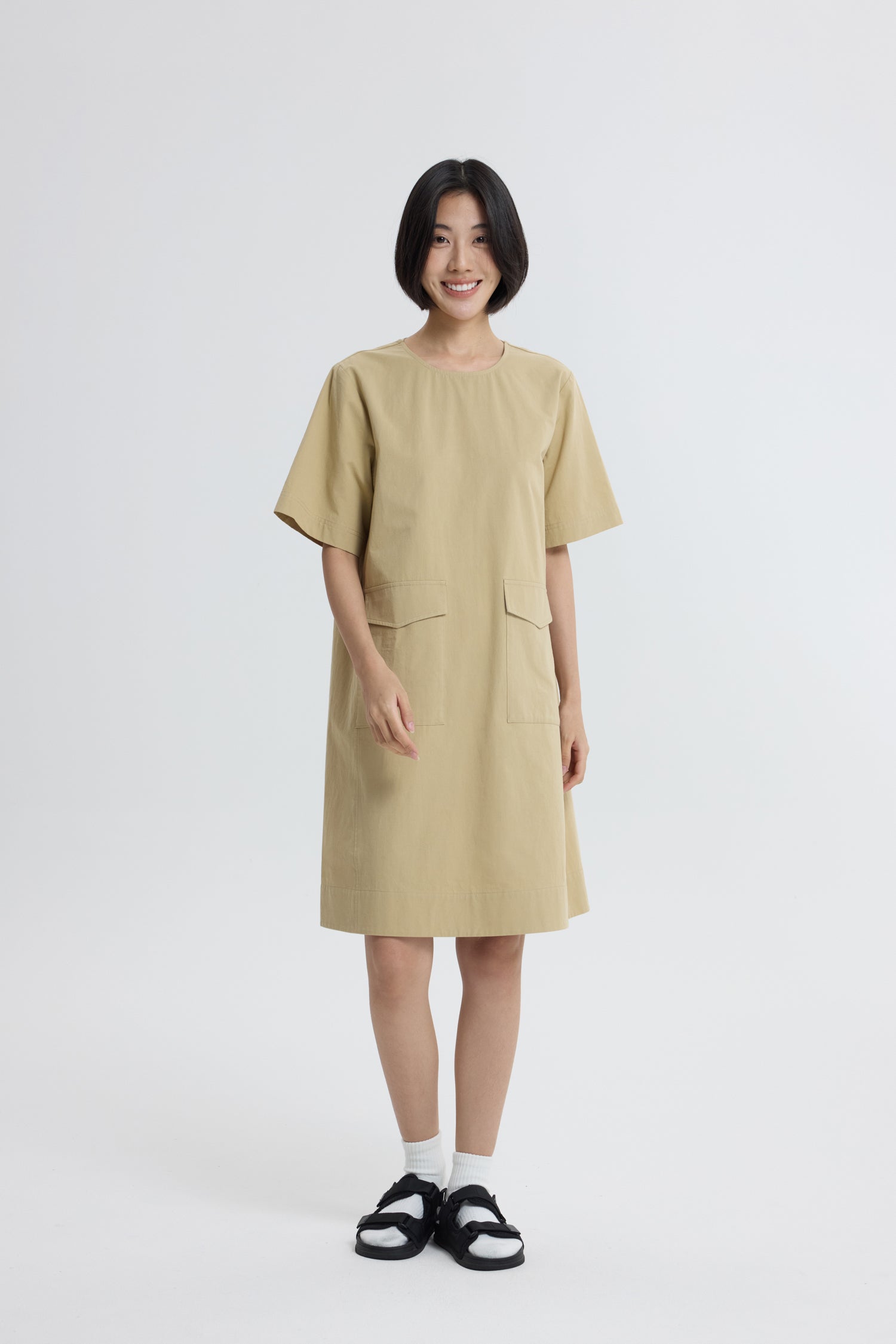 A modern utility silhouette with a refined touch, this short dress features two flap patch pockets that add structure and functionality. Designed with clean short sleeves and a tailored fit, it balances practicality with feminine ease. The smooth fabric and thoughtful proportions make it a versatile piece, perfect for casual outings or dressed up with sleek accessories for a polished look.
