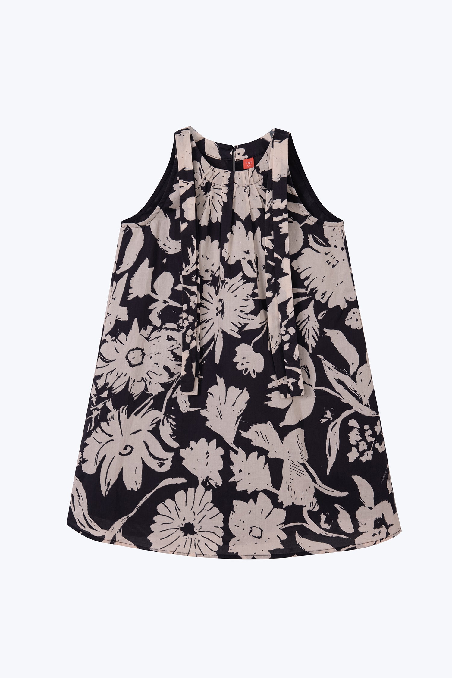 A lightweight sleeveless dress with bold floral prints and front tie detail, perfect for warm days and easy everyday styling.