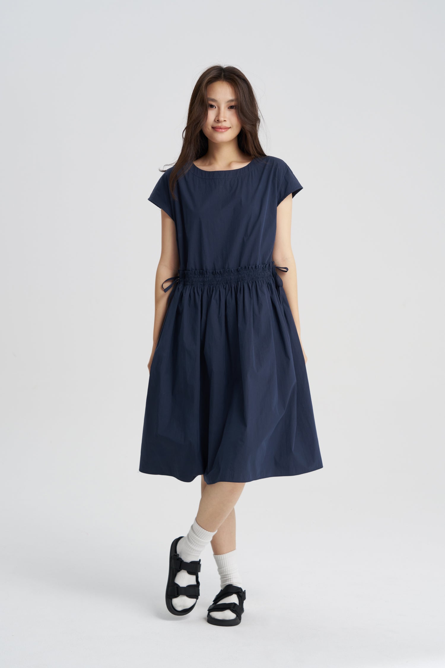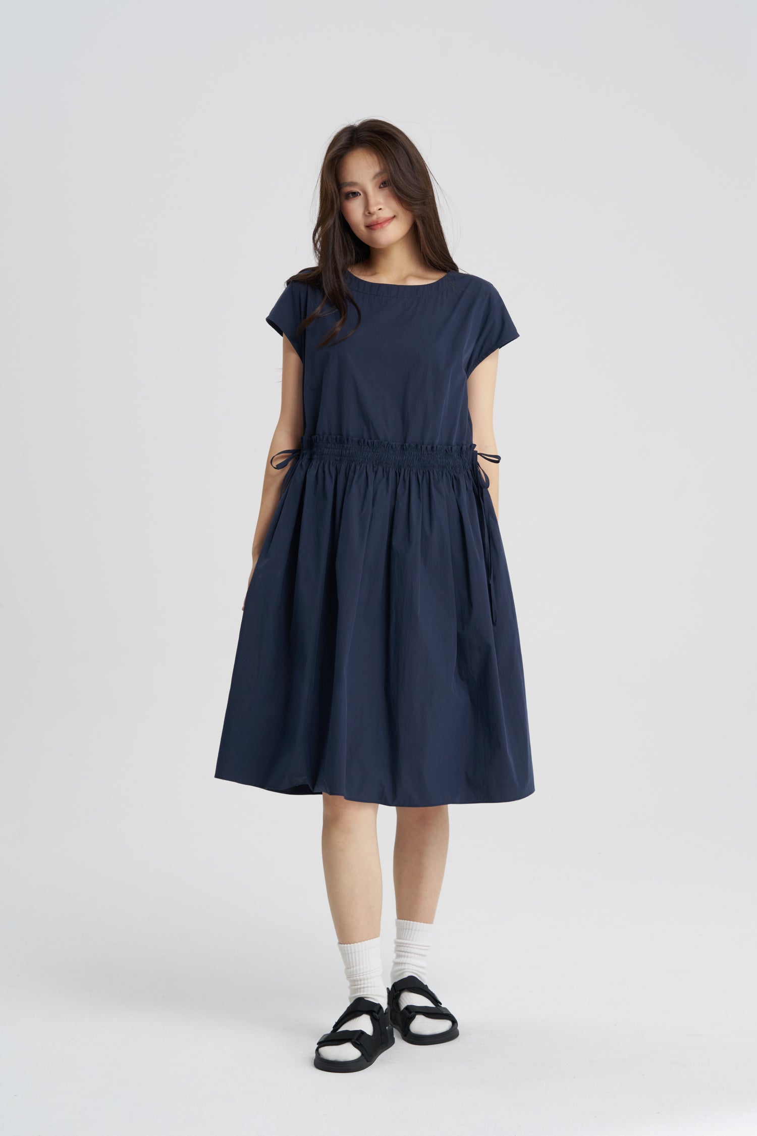 Effortlessly chic and endlessly versatile, this nylon waist-gathered dress brings comfort and modern style together. The gathered detail adds subtle texture and structure, making it perfect for both casual outings and elevated occasions. For a fresh, contemporary look, style it with long white pants—ideal for layering and adding a touch of contrast and sophistication.