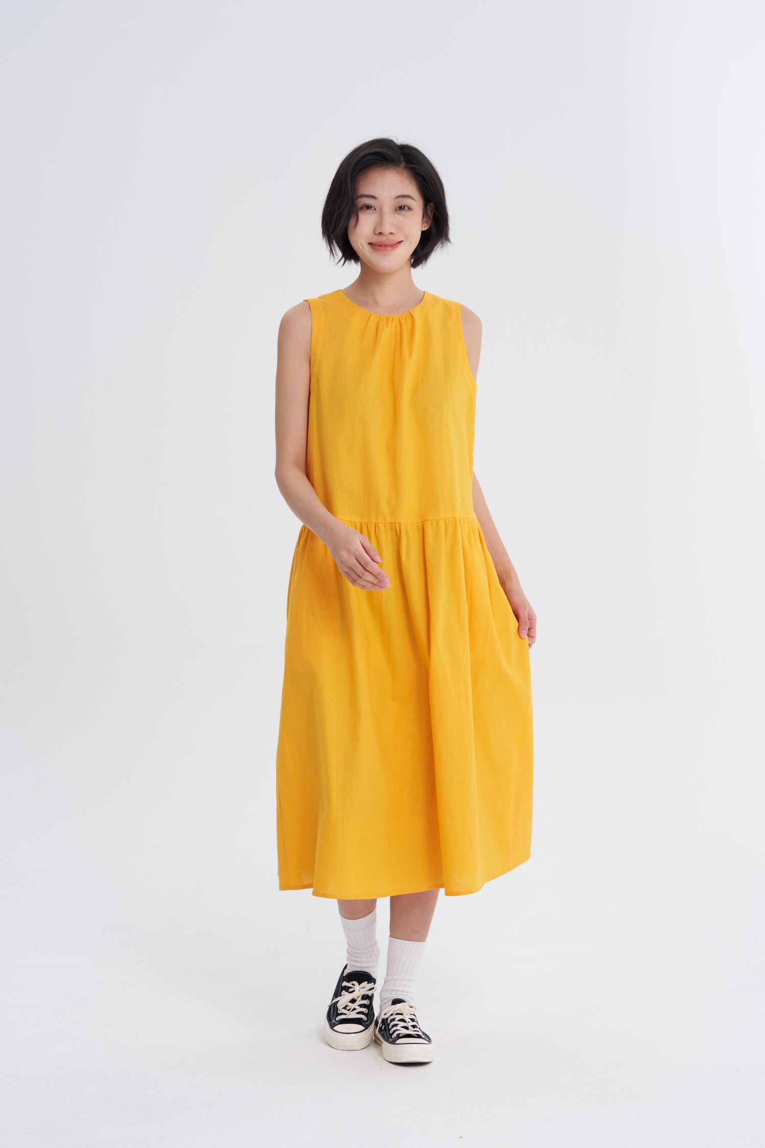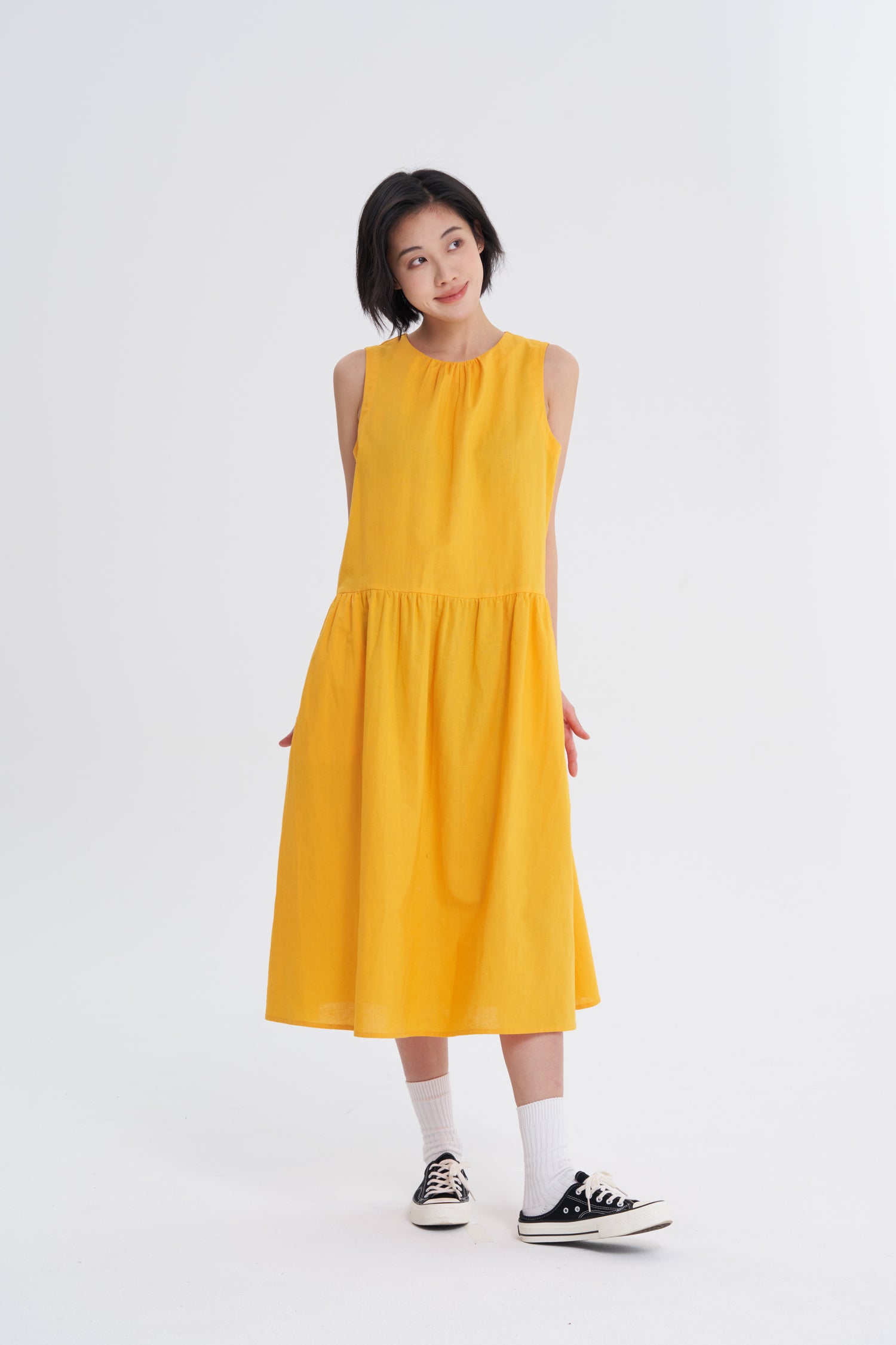 A sleeveless dress with a playful twist. Designed with a softly gathered front neckline for subtle texture, it falls into a straight silhouette with a slightly dropped waist details following with a gently gathered skirt. The hemline features soft draping accents, creating movement and a touch of elegance. Finished with a back closure for ease, this piece balances simplicity with distinctive character—perfect for both casual days and dressed-up occasion