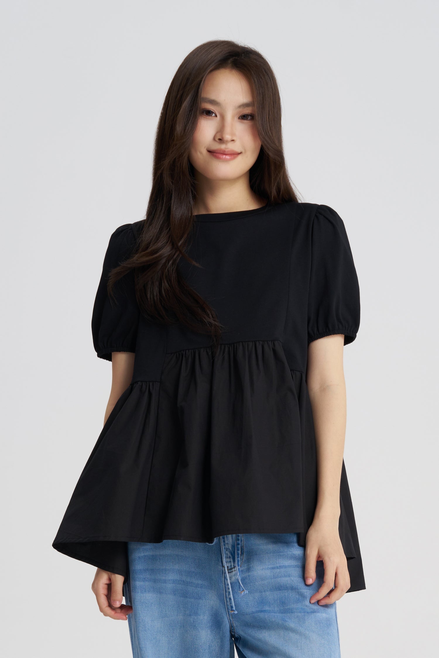 A playful gathered tee that combines casual ease with feminine charm. Designed with a classic crew neckline and slightly puffed half sleeves, it balances structure with softness. The gathered waist seam creates a flared, tiered effect that adds movement and volume to the silhouette. Finished with a relaxed fit and fluid drape, this piece is perfect for bringing a touch of feminine style to everyday looks.