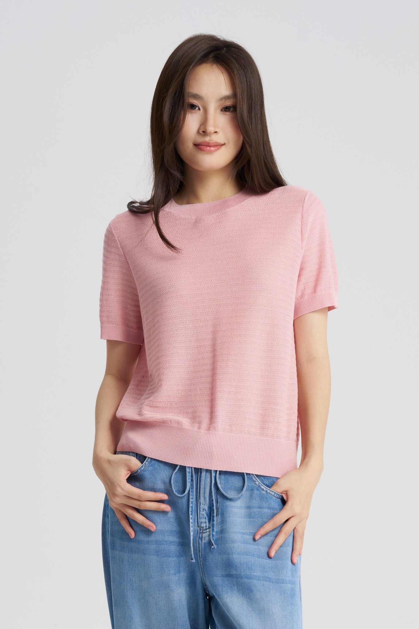 A refined knit top that combines comfort with subtle texture. Crafted in a lightweight knit, it features a clean silhouette with soft horizontal textures. Designed to be breathable and versatile, it works effortlessly as a standalone statement or layered under jackets and cardigans.