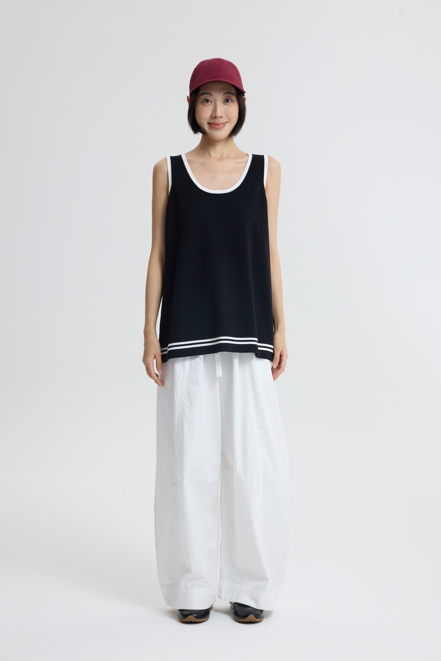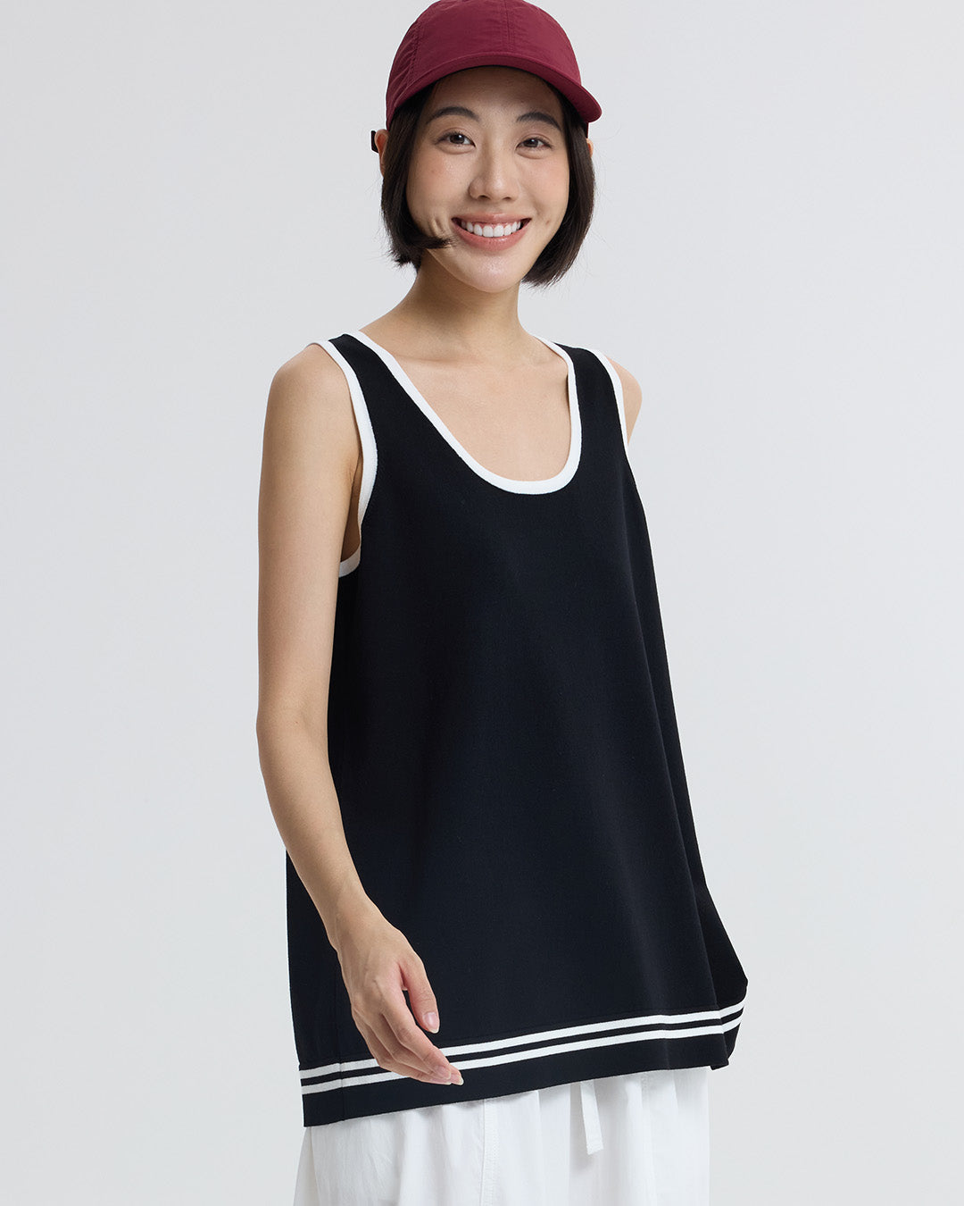 A modern essential with a sporty edge — this sleeveless knitted tunic features a clean, streamlined silhouette accented by two contrasting stripes at the hem. Crafted from a soft, breathable knit, it drapes effortlessly for all-day comfort. Perfect for layering or wearing on its own, it adds a punch to any casual or elevated look.