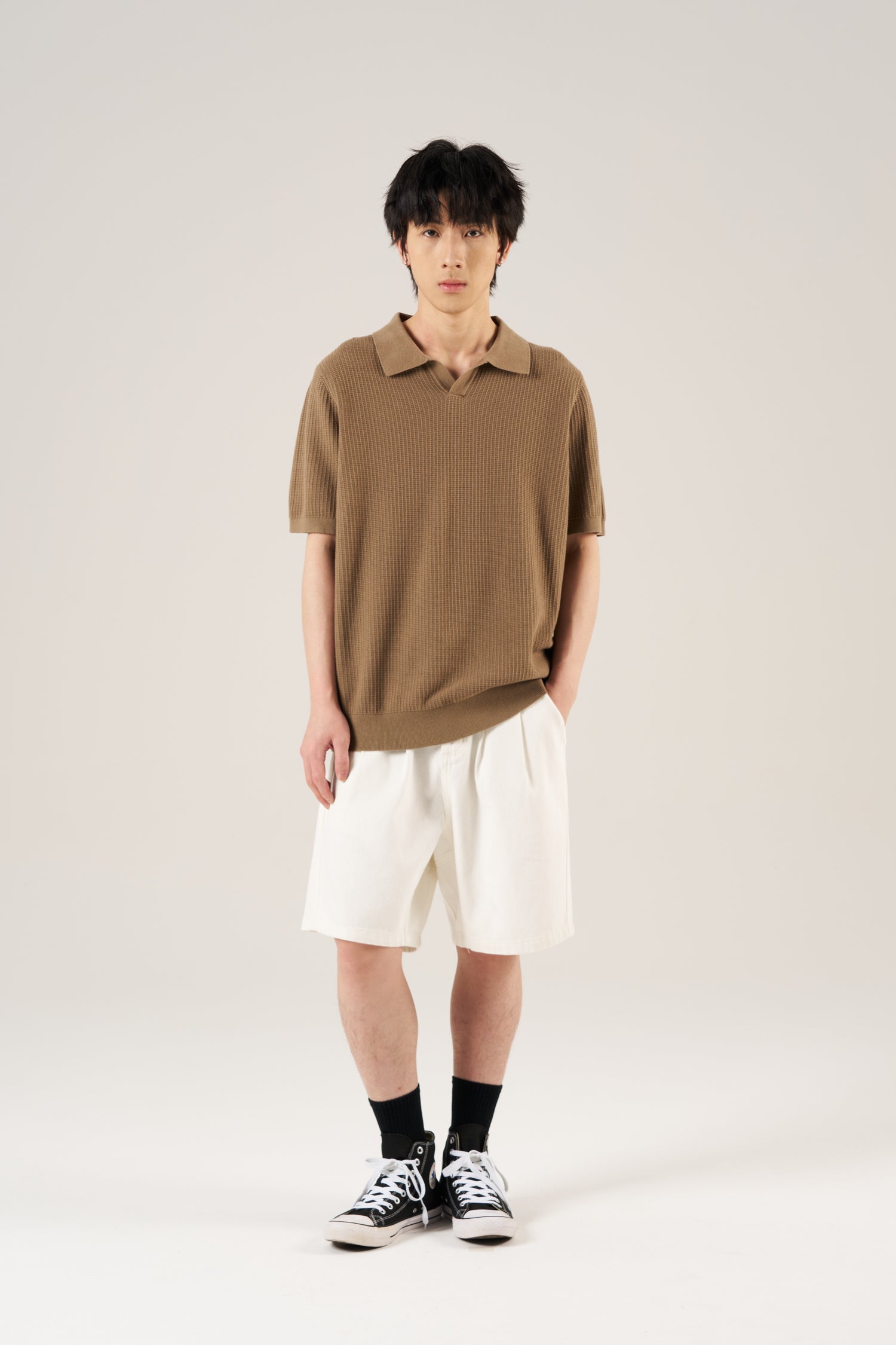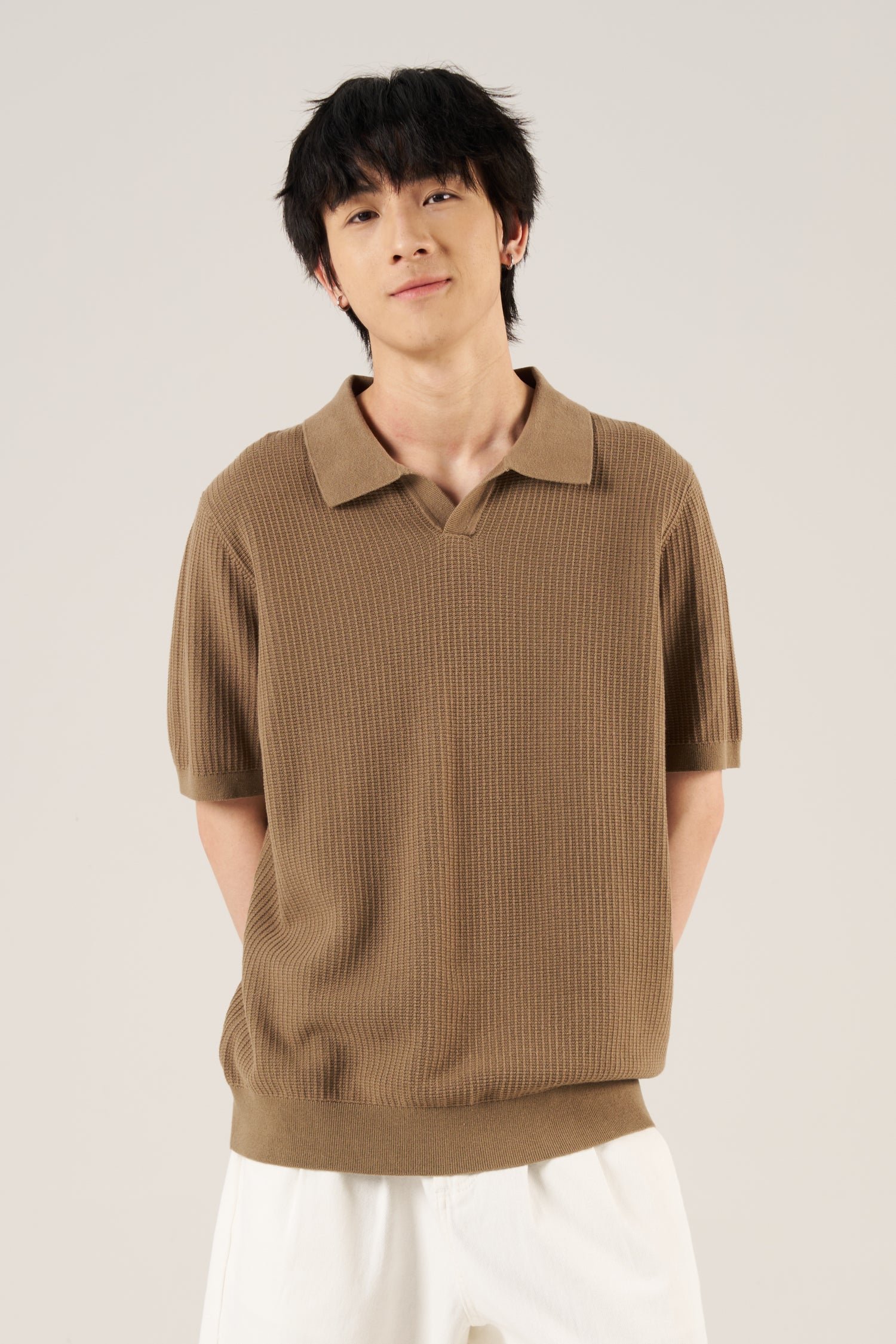 Crafted from breathable waffle-knit, this open collar tee blends comfort and structure. Its laid-back design works well on its own or layered for a casual, contemporary look.