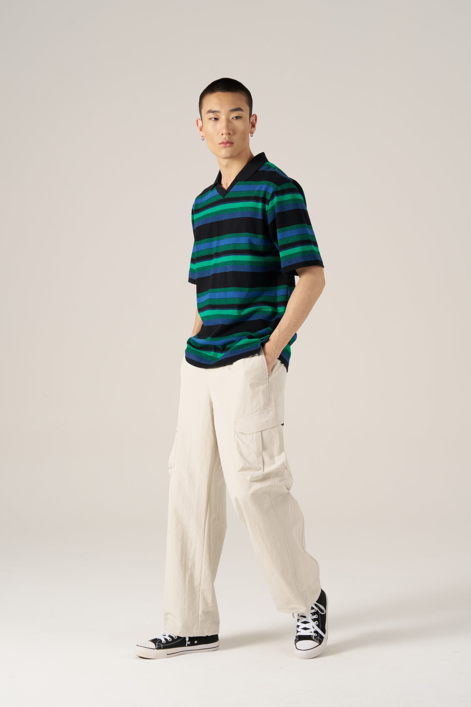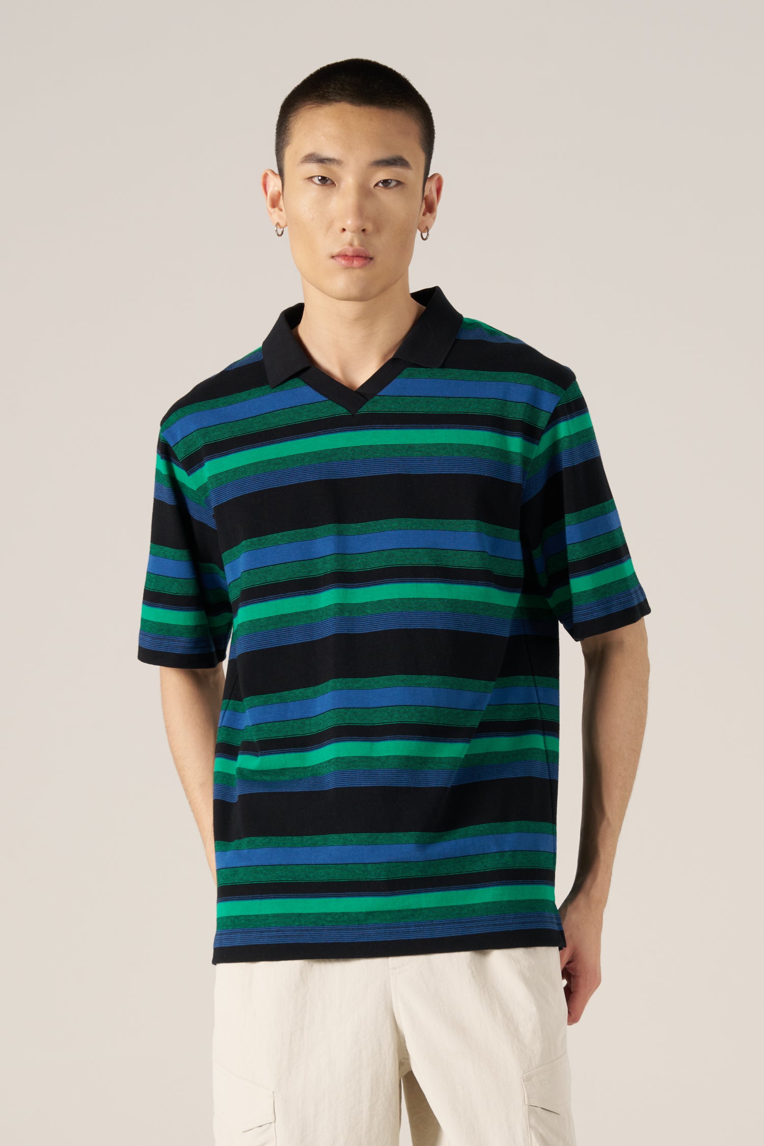 A relaxed striped tee finished with an open collar for a fresh, modern twist. Soft, breathable fabric and an easy silhouette make it perfect for everyday casual wear.