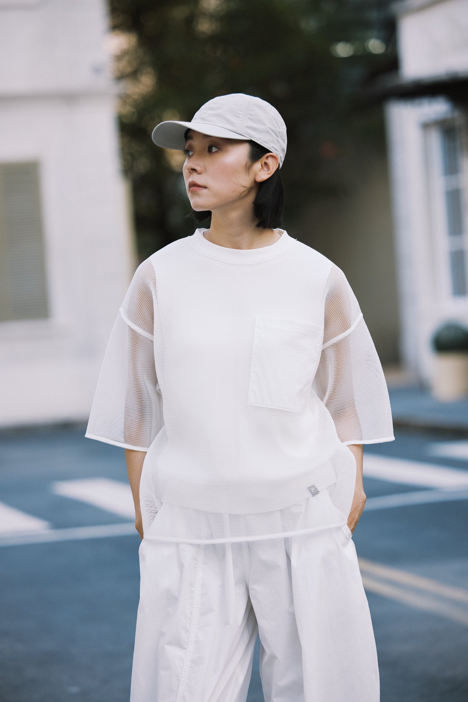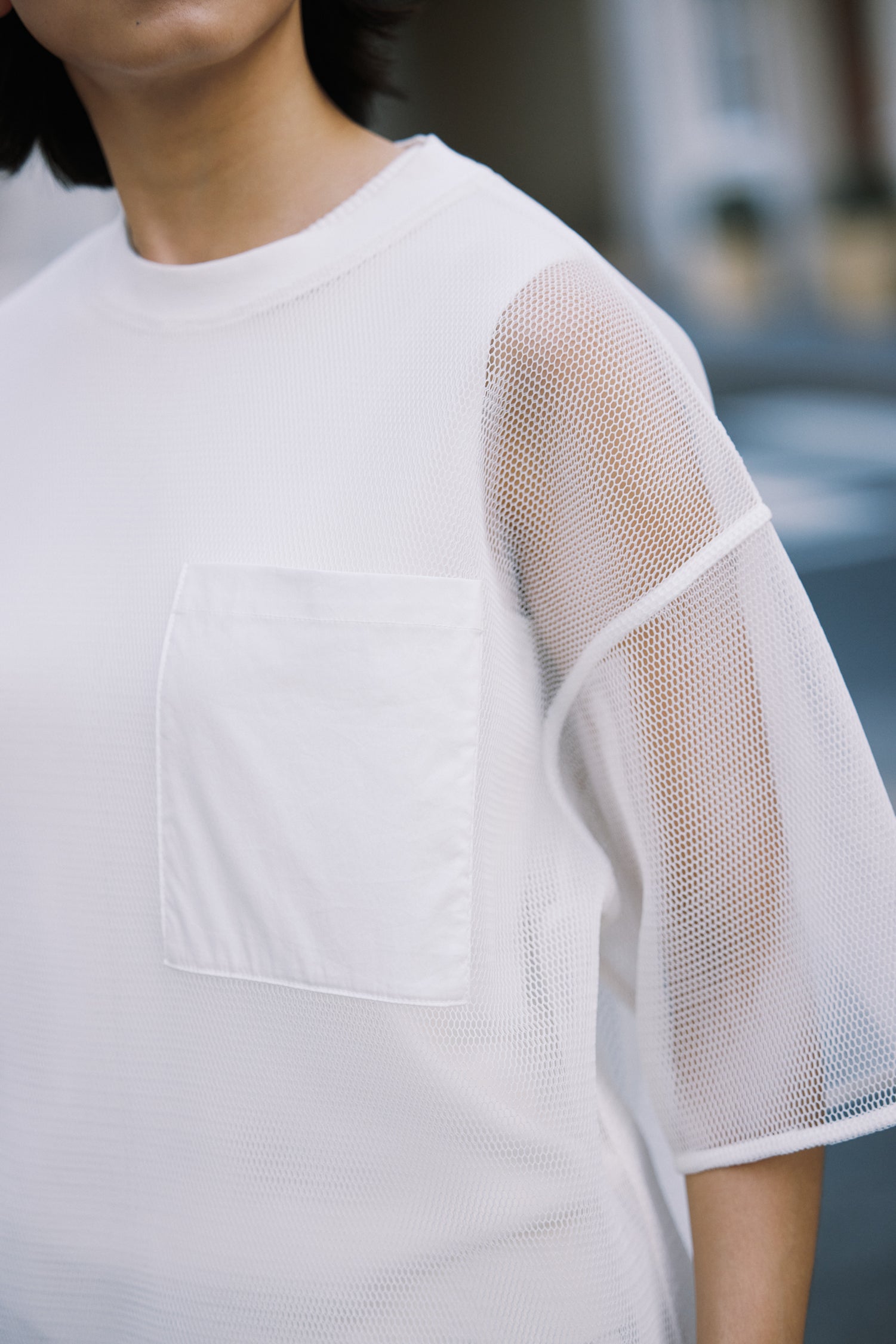 This oversized mesh tee features a relaxed, airy fit with a patch pocket for a touch of utilitarian charm, perfect for effortless layering. Pair it with a pleated mesh skirt for a playful, textured look or bermuda shorts for a relaxed, street-ready vibe—ideal for breezy summer days or casual outings. The lightweight, breathable fabric ensures comfort while the loose silhouette adds an edgy, laid-back appeal.