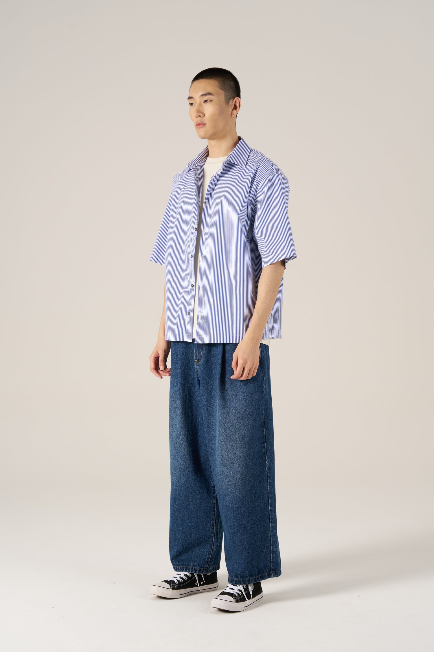 Made from a cotton-nylon blend, this oversized striped shirt has a relaxed fit with a neat, structured look. A simple piece that works with any casual outfit.