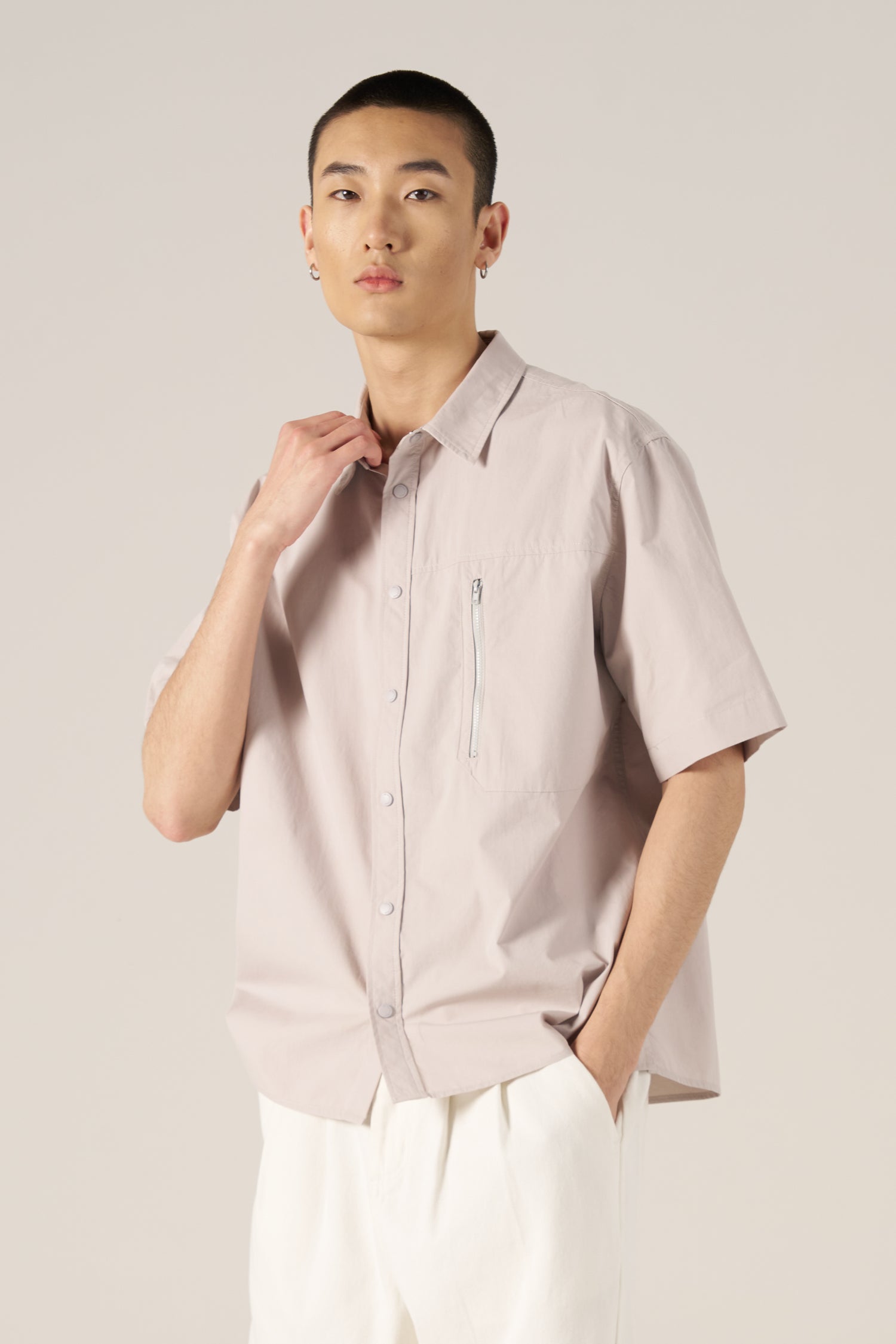 A structured shirt featuring a front patch pocket set against a horizontal panel cutline for subtle visual contrast.