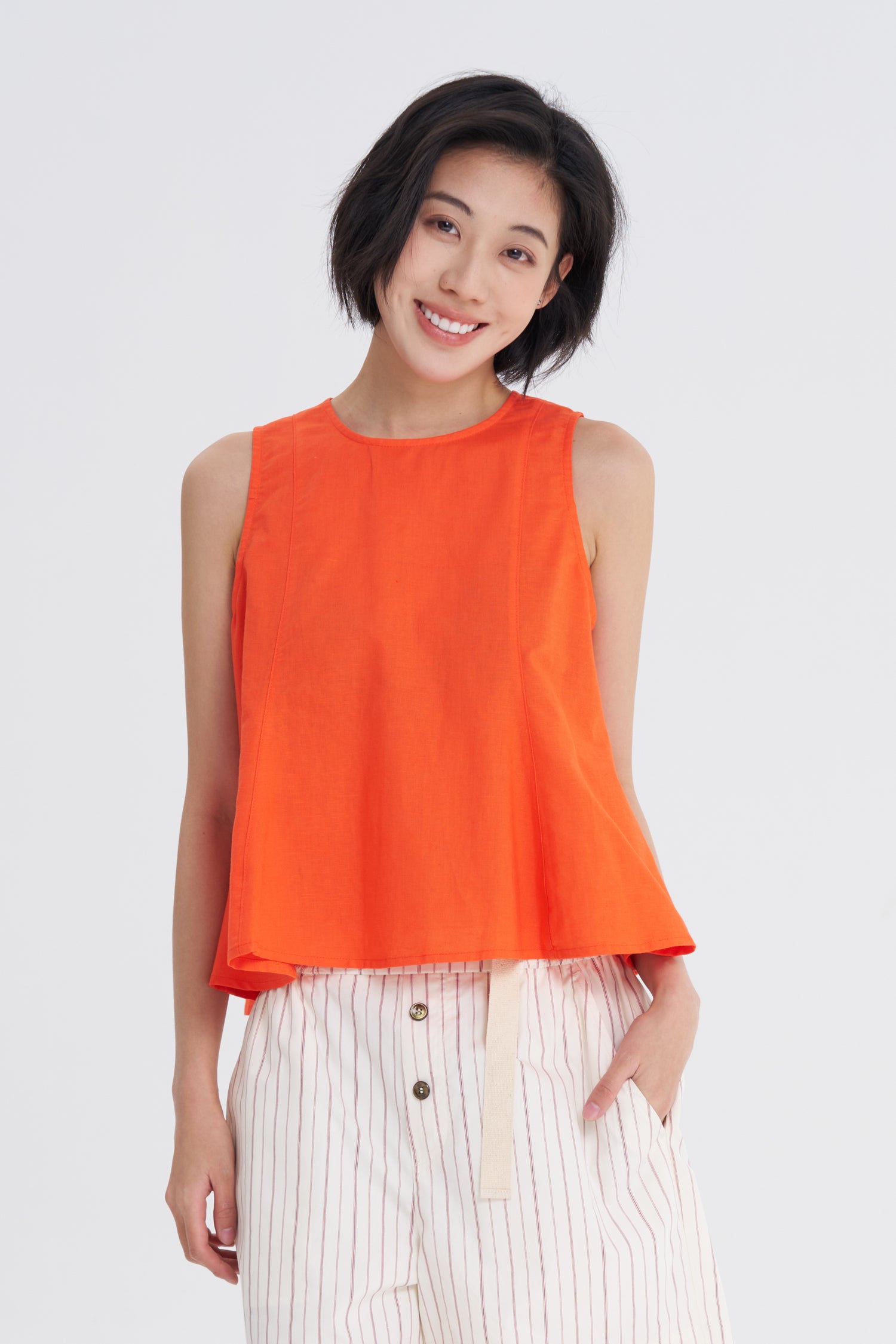 A fresh take on everyday linen, this sleeveless top shows off a sleek, feminine silhouette with a fitted bodice and a lightly flared hem. Clean vertical panels create a lengthened, sculpted look, while the round neckline keeps things modern and minimal. Lightweight and effortlessly versatile, it’s the kind of piece that elevates any outfit—from tailored trousers to easy weekend shorts—without even trying.