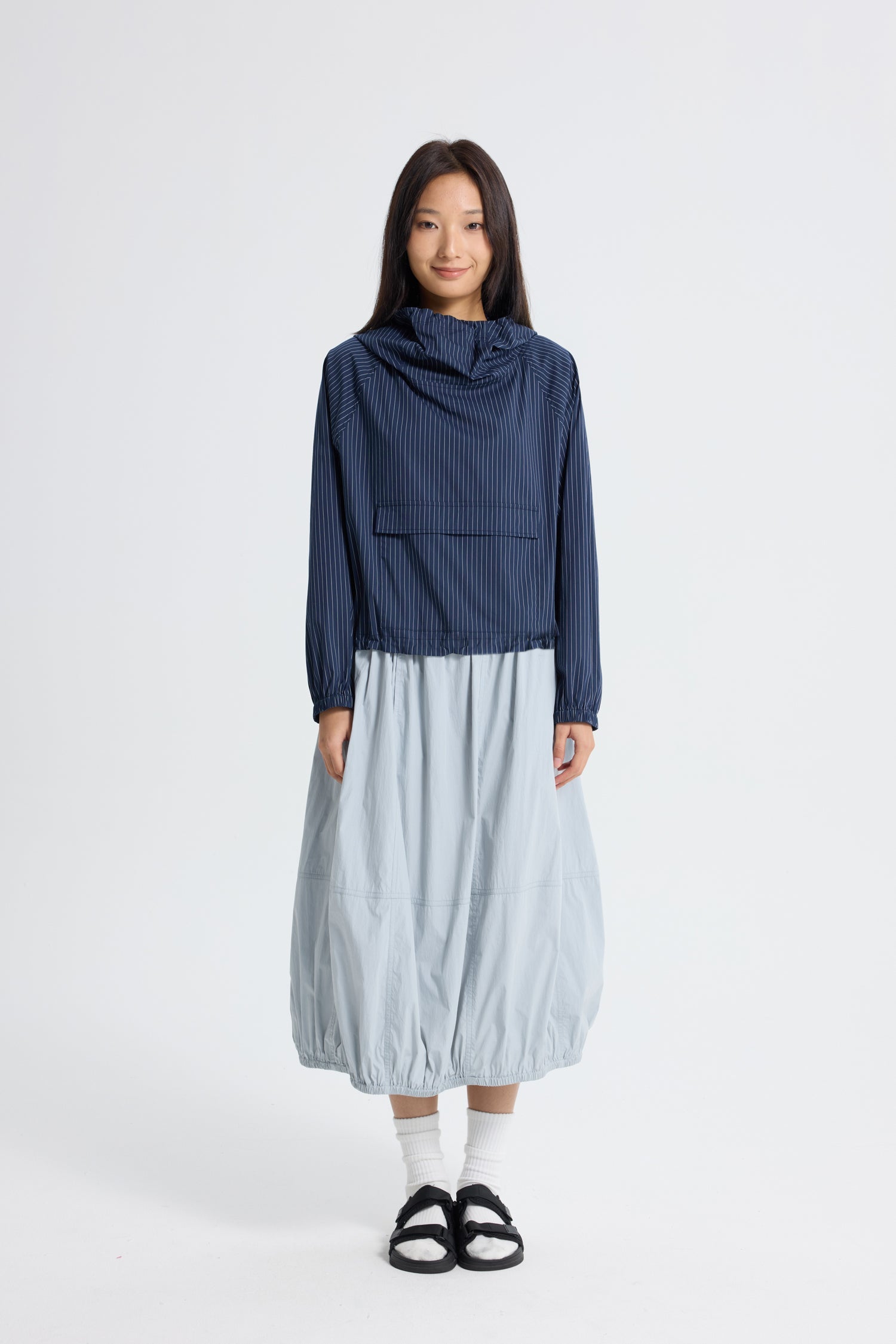 A statement in movement and ease, this long parachute skirt features a voluminous silhouette tempered by a softly gathered elastic hem. Crafted from lightweight fabric with a subtle sheen, it drapes fluidly while offering a modern, utilitarian charm. The elasticated waistband ensures comfort and flexibility, making it an effortless choice for all day wear. Style it with a fitted top or structured blouse to balance its airy proportions with understated elegance.