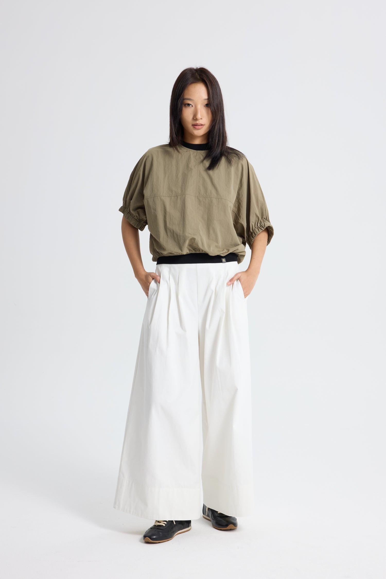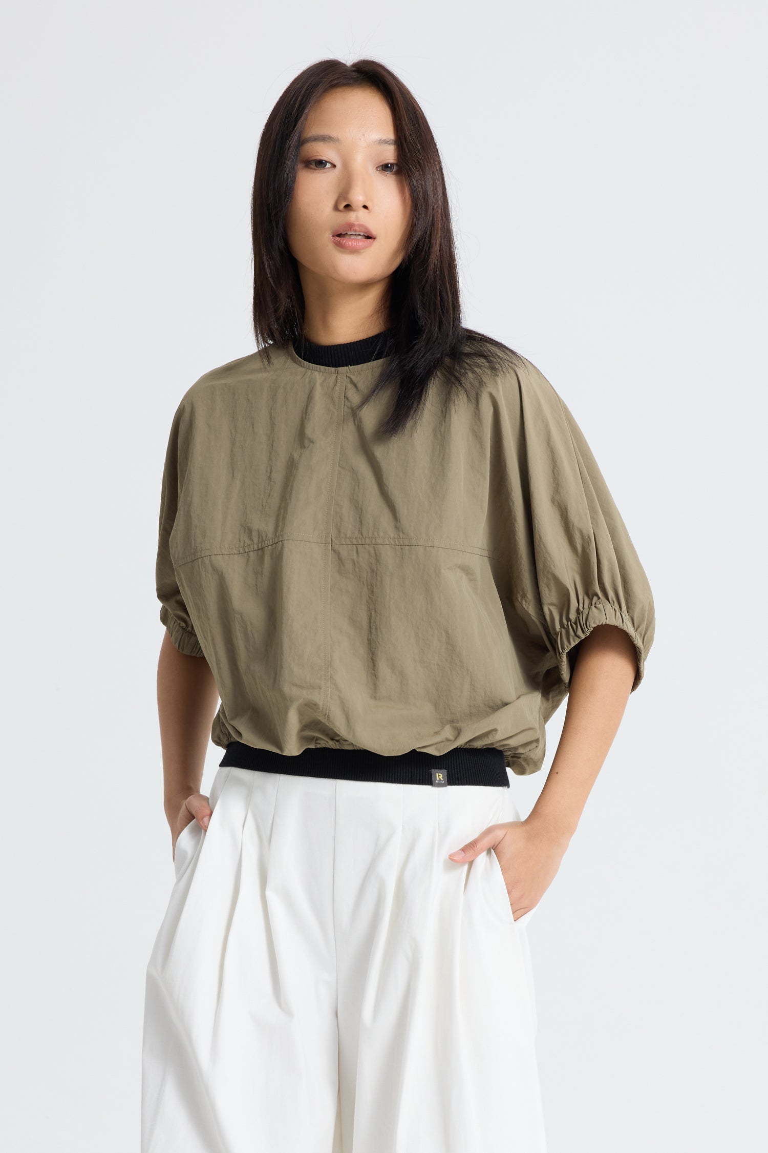 Lightweight and airy, this parachute top is designed with a relaxed silhouette and gathered elastic hem for a softly sculpted shape. The fluid fabric drapes effortlessly, bringing ease and movement to the look while maintaining a refined finish. Perfect for pairing with streamlined bottoms, it balances volume with understated sophistication.