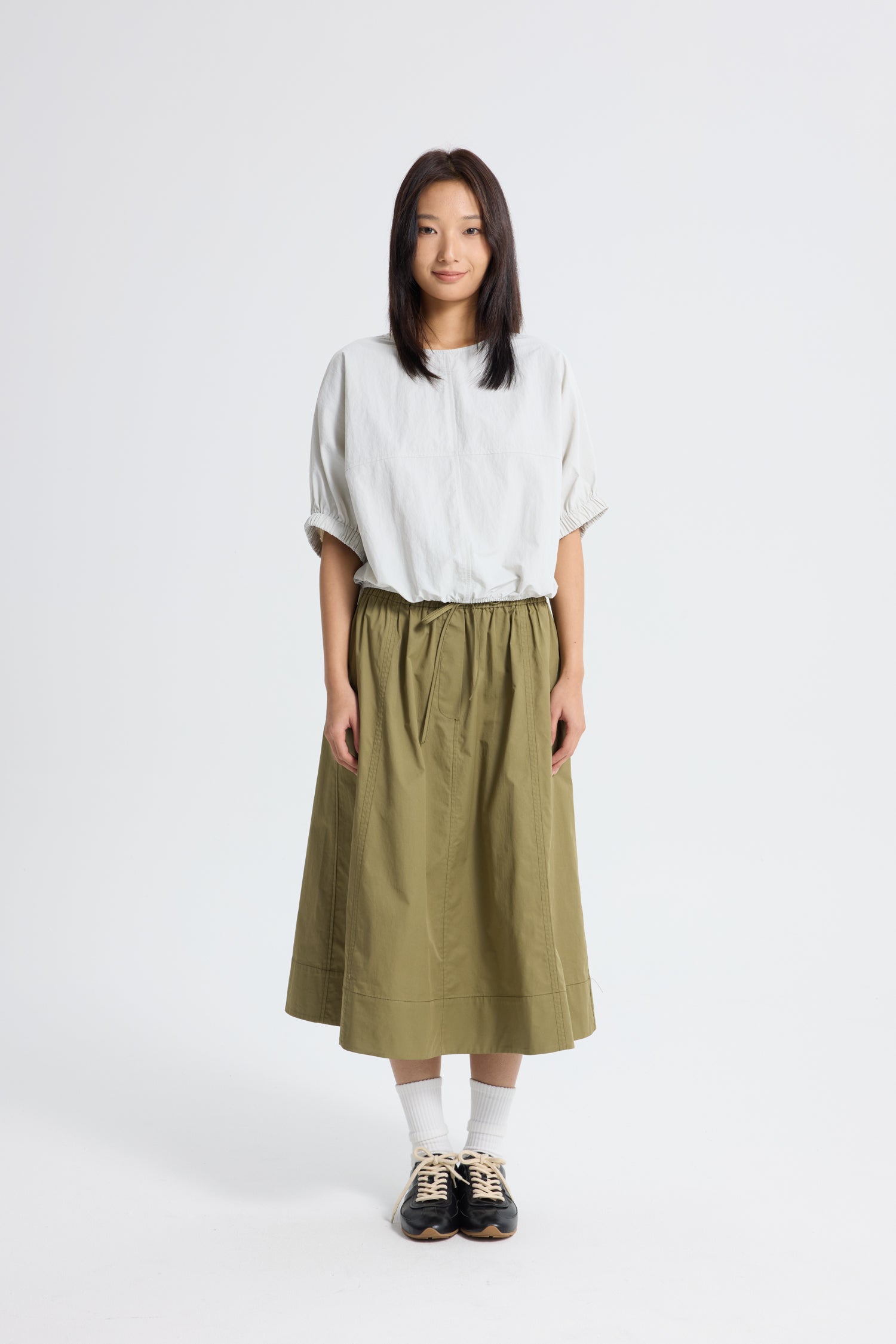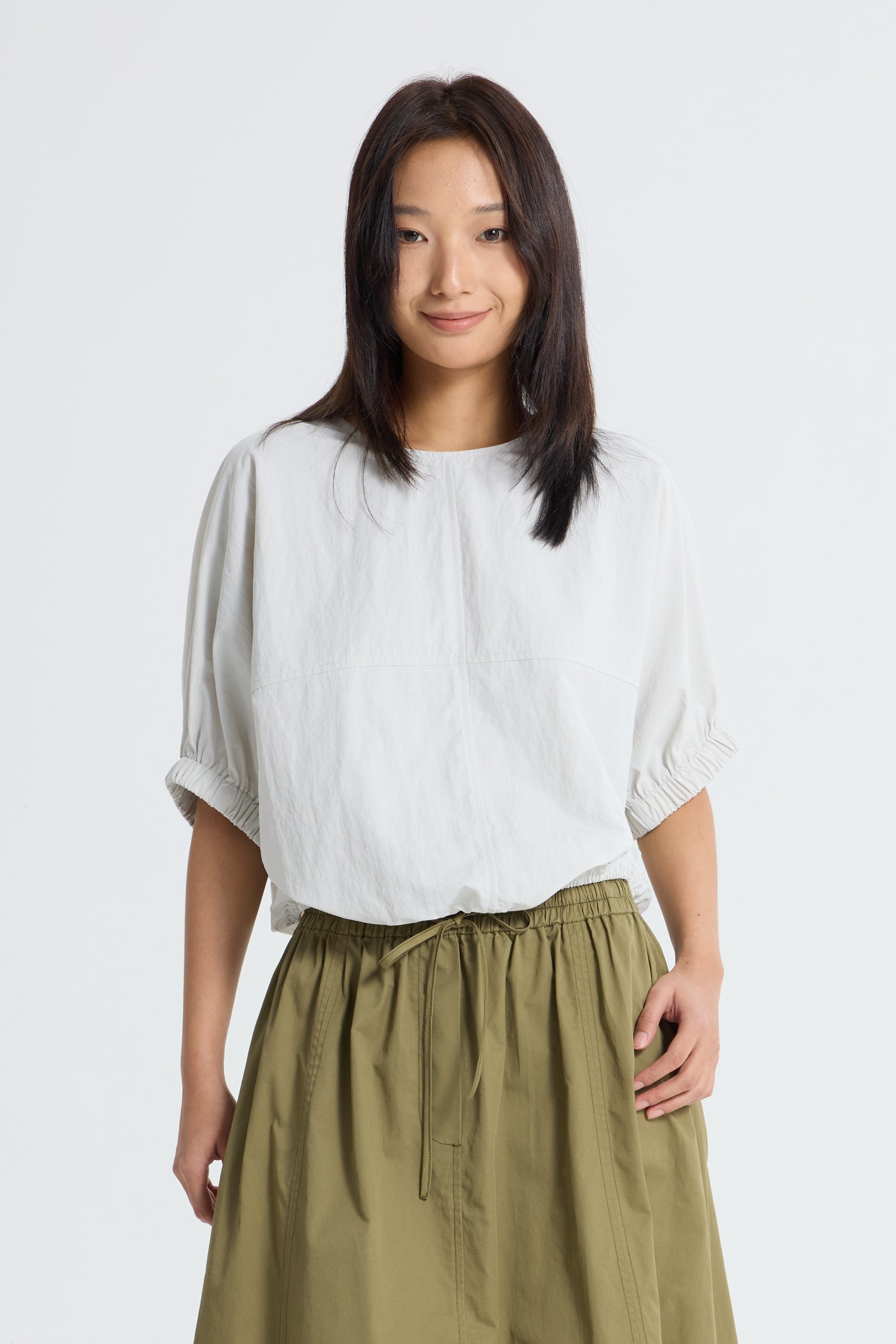 Lightweight and airy, this parachute top is designed with a relaxed silhouette and gathered elastic hem for a softly sculpted shape. The fluid fabric drapes effortlessly, bringing ease and movement to the look while maintaining a refined finish. Perfect for pairing with streamlined bottoms, it balances volume with understated sophistication.