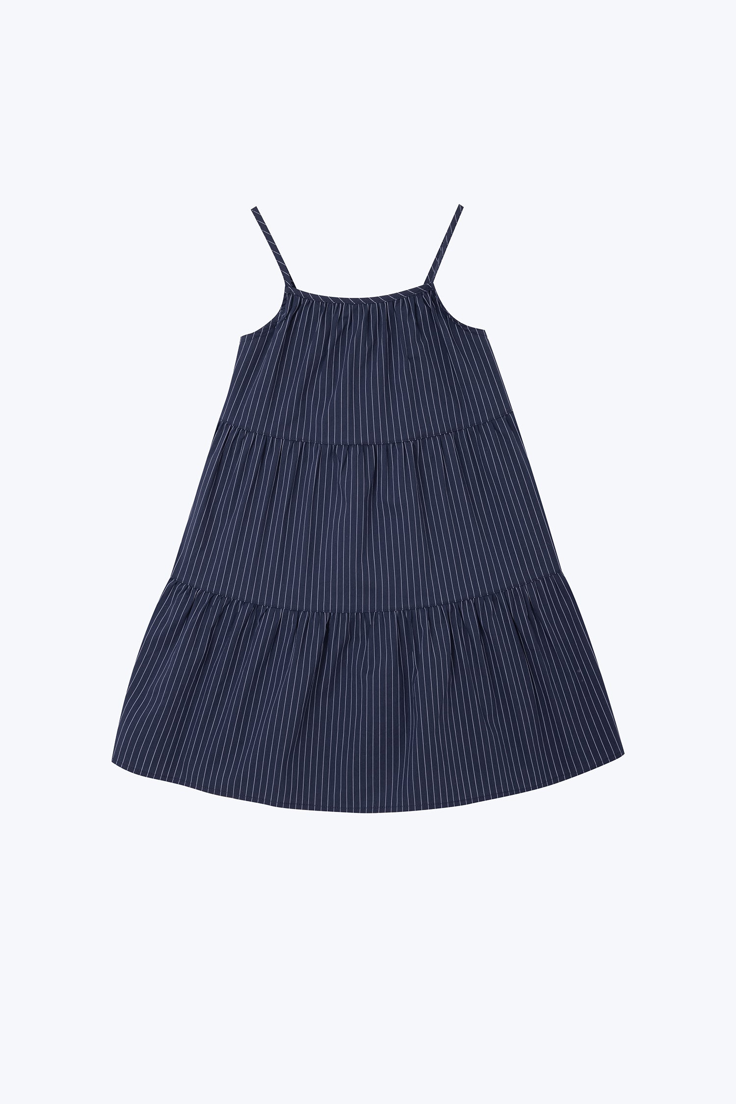 A charming navy dress with delicate pinstripes, featuring a tiered silhouette for playful movement. Perfect for everyday wear or special outings, this stylish piece combines classic stripes with a modern, girly touch.