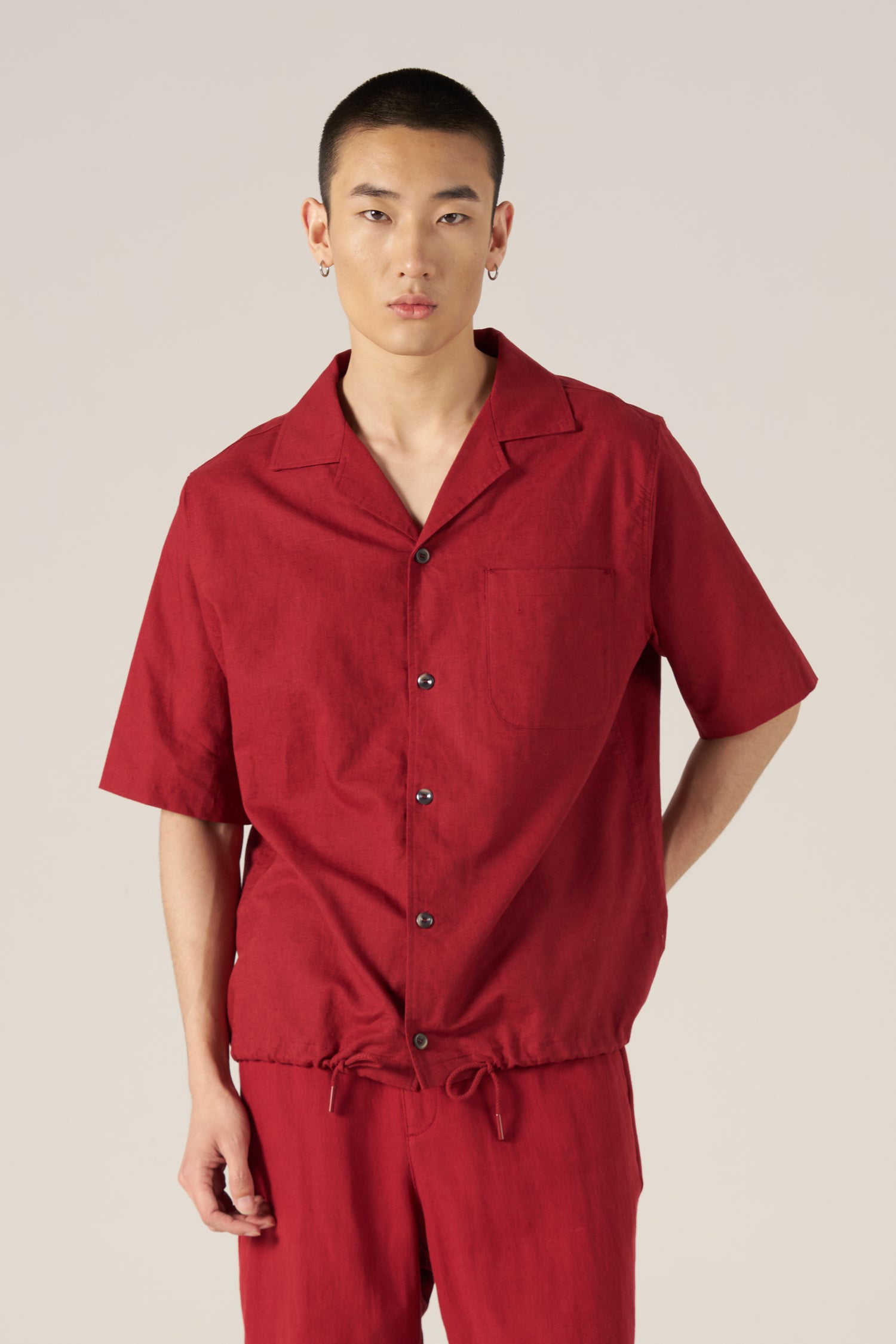 Relaxed and breathable, this linen-cotton blend shirt features a bowling collar, short sleeves, and a chest pocket. An adjustable drawstring hem adds a modern, versatile finish.