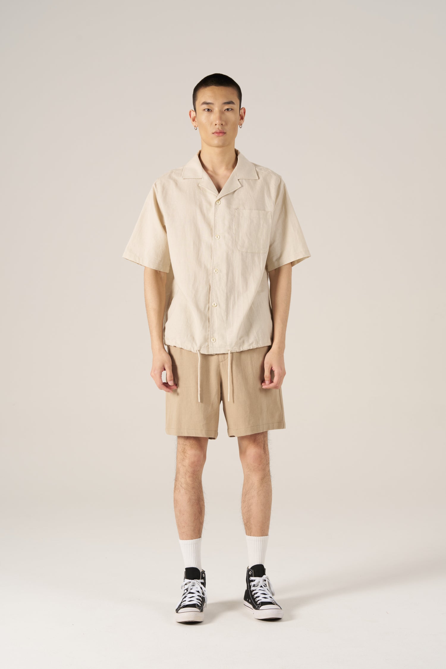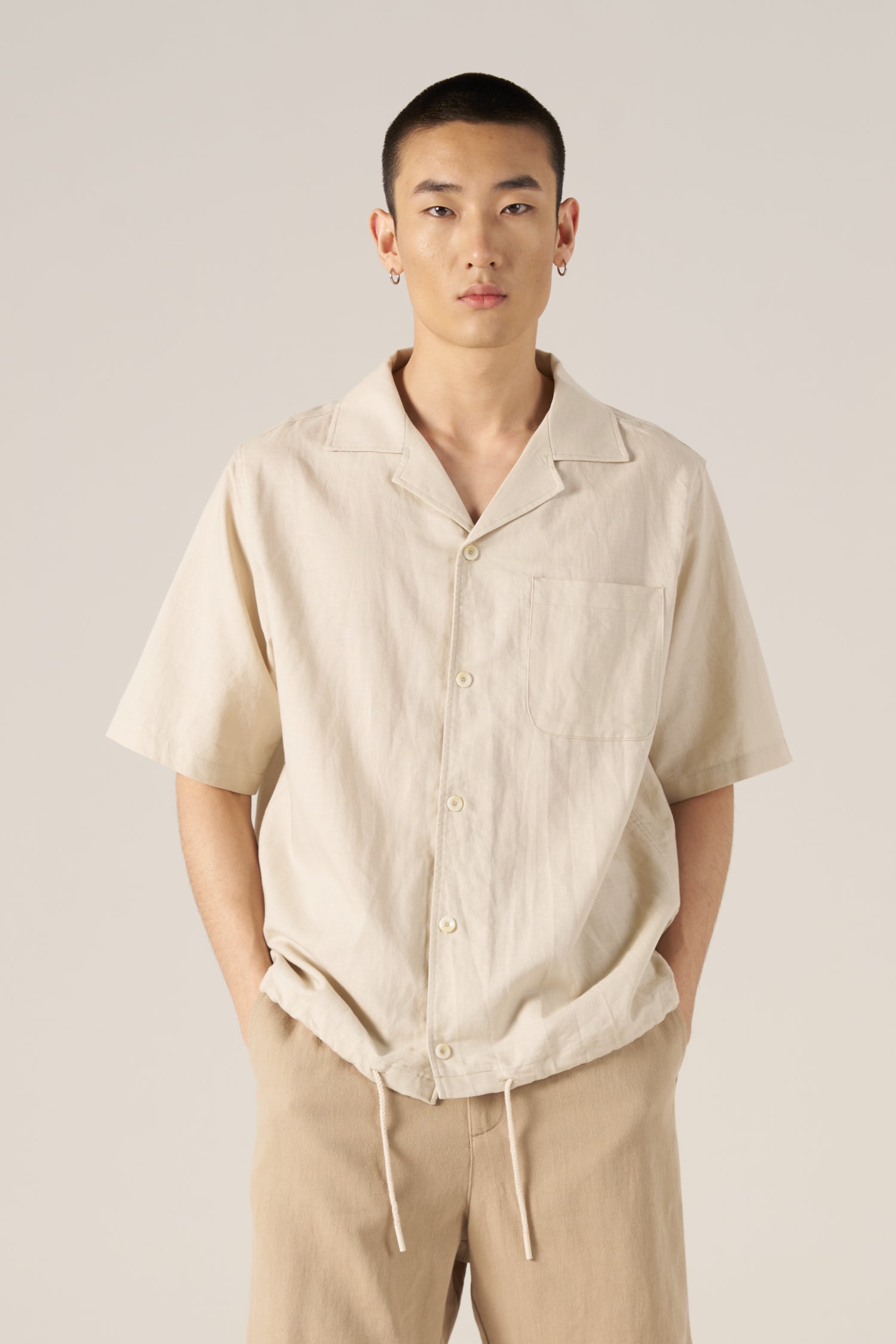 Relaxed and breathable, this linen-cotton blend shirt features a bowling collar, short sleeves, and a chest pocket. An adjustable drawstring hem adds a modern, versatile finish.