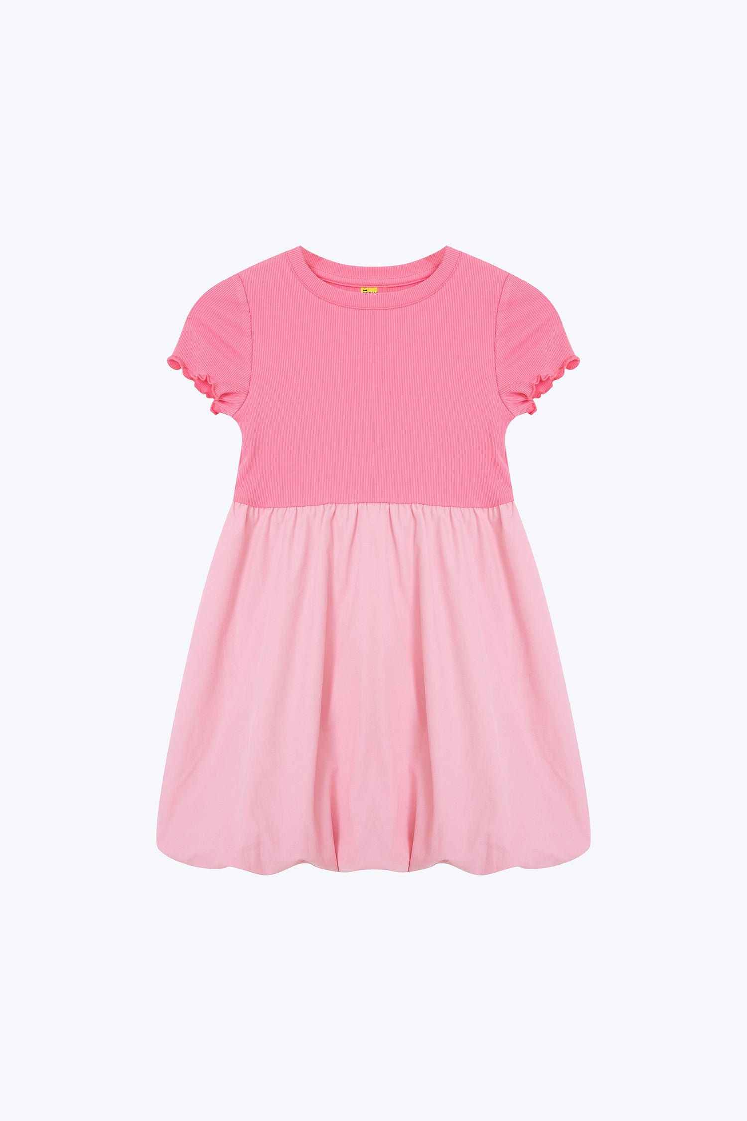 A sweet dress featuring a ribbed bodice and a softly gathered bubble hem skirt. With short sleeves and a round neckline, it blends comfort with playful charm for everyday wear or special outings.