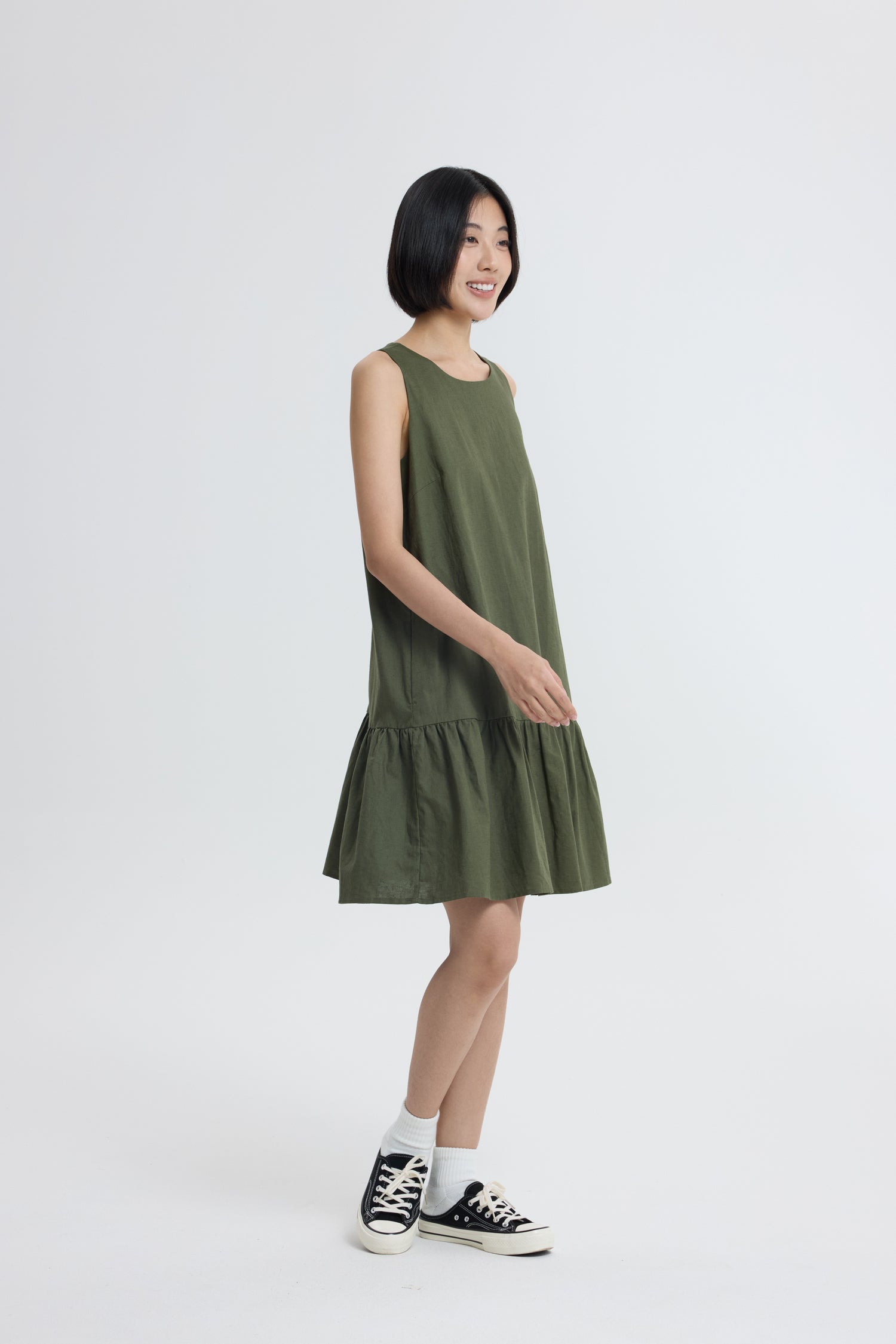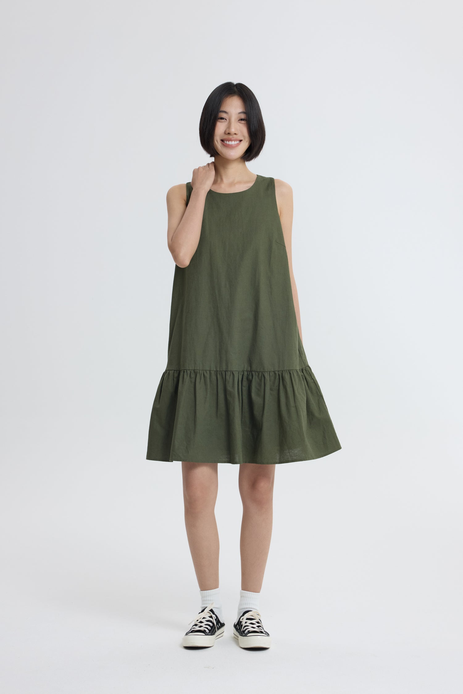Whether you’re strolling through the city or lounging with friends, this dress brings a fresh, breezy vibe that’s impossible to resist. Made from breathable linen-cotton, it’s your ticket to all-day comfort and effortless style. The sleeveless design keeps things cool while the playful ruffle hem adds a dose of whimsy and movement. Get ready to twirl into summer with this fun and flirty piece!