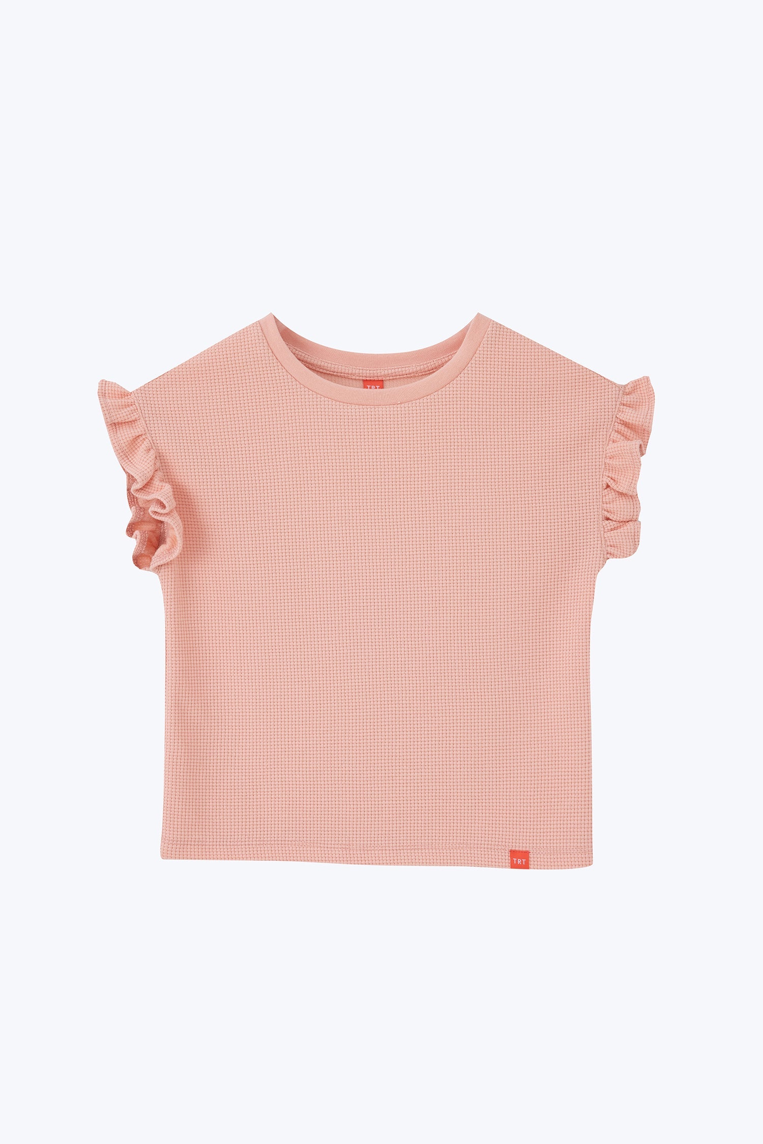 This tee brings a touch of fun with its delicate ruffle sleeves, making everyday outfit a little more special.