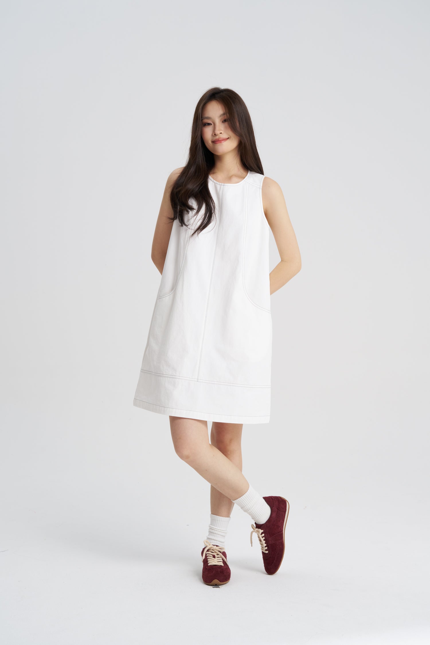 A sleeveless seamline dress designed with a clean silhouette for easy everyday wear. Featuring a round neckline and panel seam details that contour the shape, it adds visual interest while keeping the look understated. Functional side pockets are seamlessly integrated into the design, enhancing practicality without compromising style. Finished with a straight hem and back zip closure, this versatile piece can be styled on its own or layered for a laid-back yet polished look.