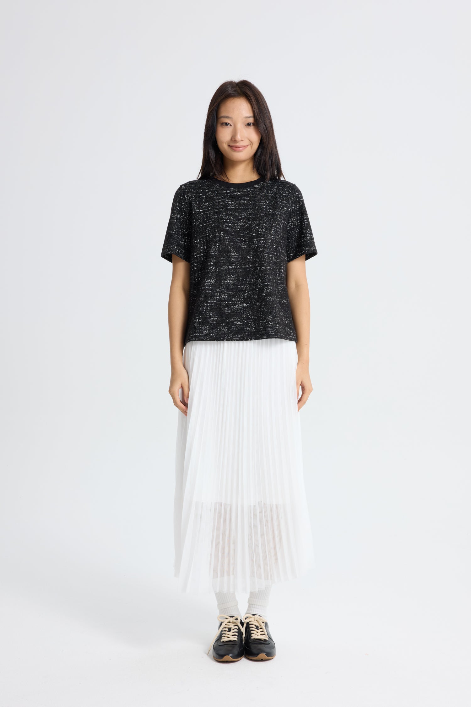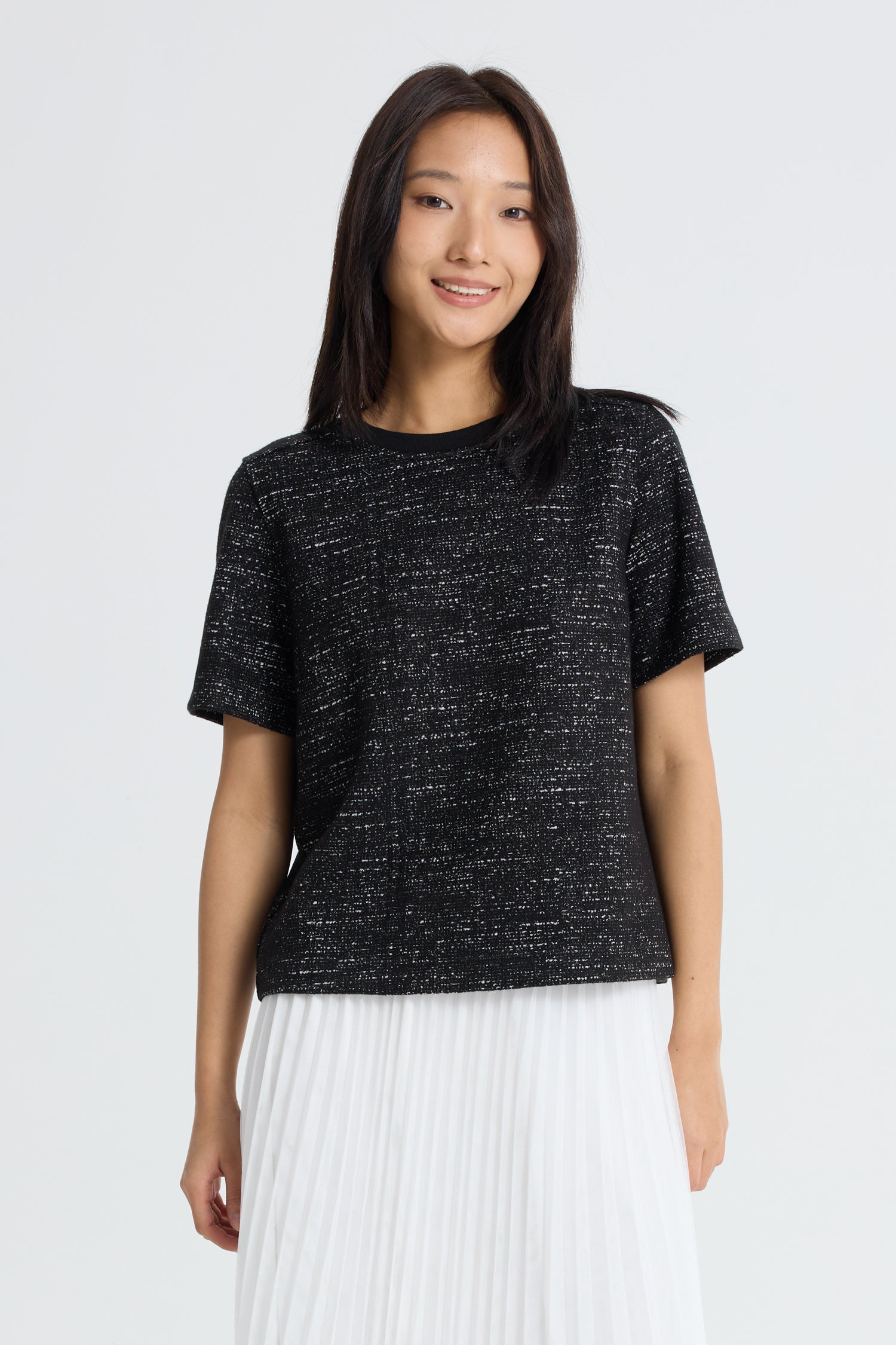 This sleek short-sleeve top combines minimalist style with subtle texture, featuring a refined ribbed collar that adds a touch of structured contrast to its effortless silhouette. Crafted in a rich black hue, it offers versatile wearability—pair it with a sleek skort for a sporty-chic vibe, or keep it casual with high-waisted jeans for an understated yet elevated vibe.