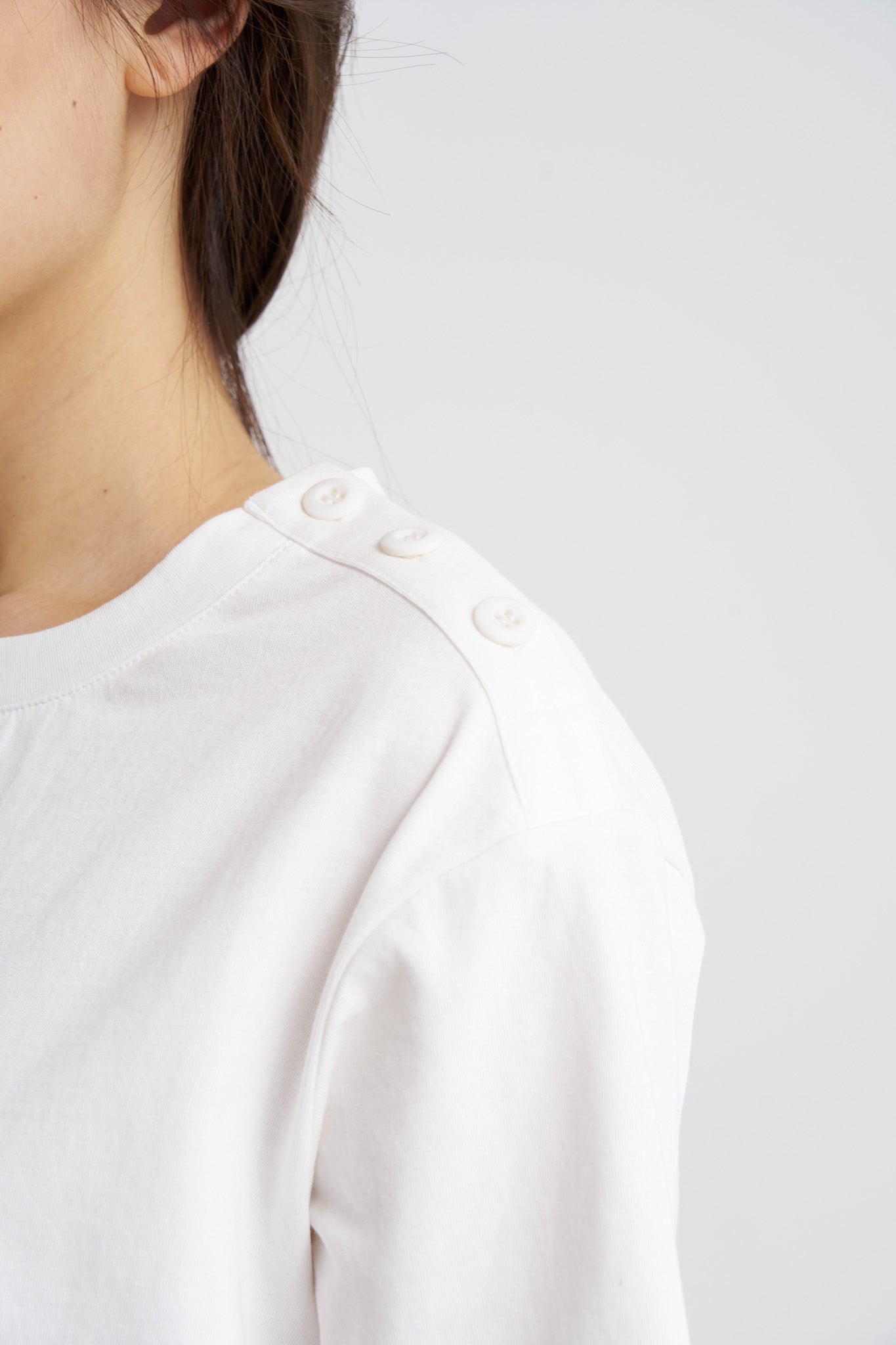 A versatile shoulder button tee that blends simplicity with a modern twist. Featuring a clean crew neckline and short sleeves, it keeps the silhouette simple and easy to wear. The distinctive detail comes from a row of functional buttons along the shoulder, adding both practicality and subtle edge. Cut in a relaxed fit, this 100% cotton piece is perfect for everyday styling, whether worn on its own or layered for added dimension.