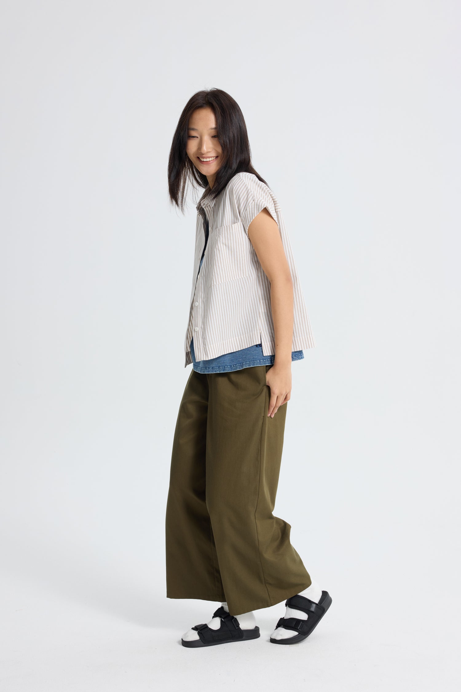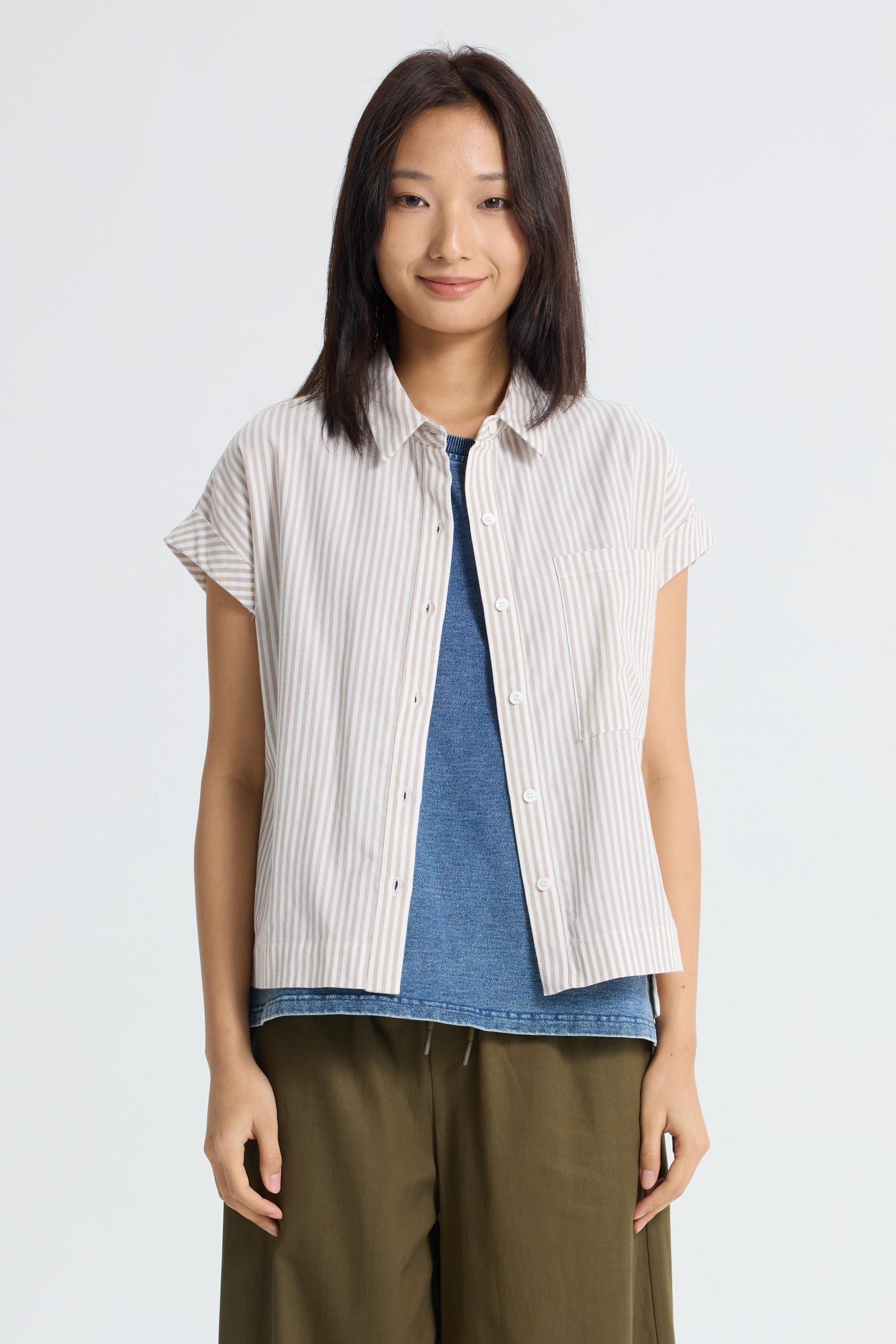 Embrace a timeless and earthy elegance with this striped blouse. The subtle stripes in soft sand and cream offer a sophisticated and neutral palette that pairs perfectly with denim for a modern outfit combination. Whether you’re wearing it over a camisole with denim shorts or styling it with a flowing midi skirt, this blouse effortlessly bridges the gap between relaxed and refined.