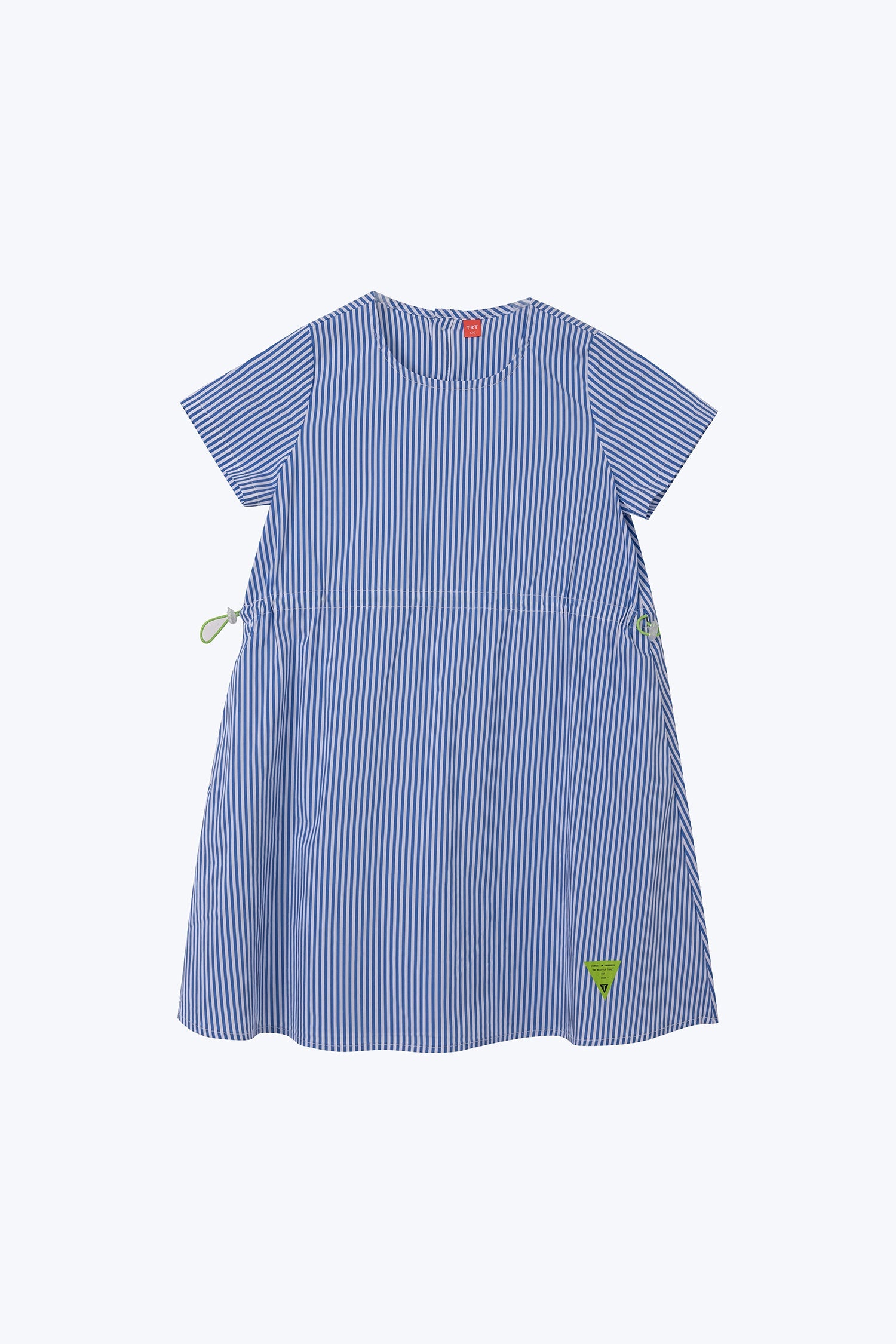 A breezy cotton dress with blue and white stripes, drawstring waist, and short sleeves. Lightweight and comfy for everyday play.