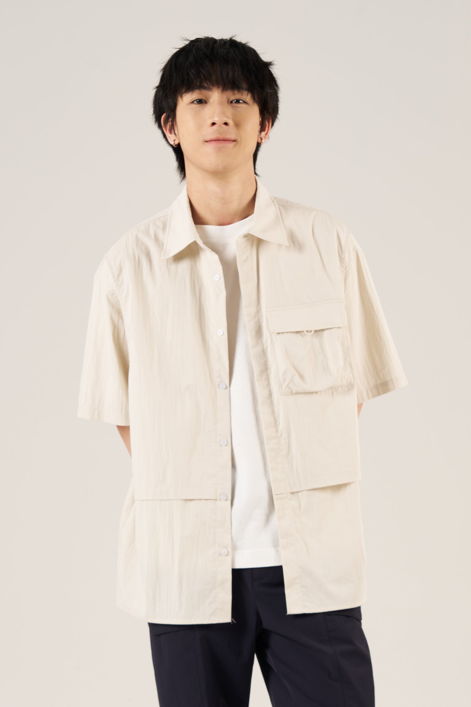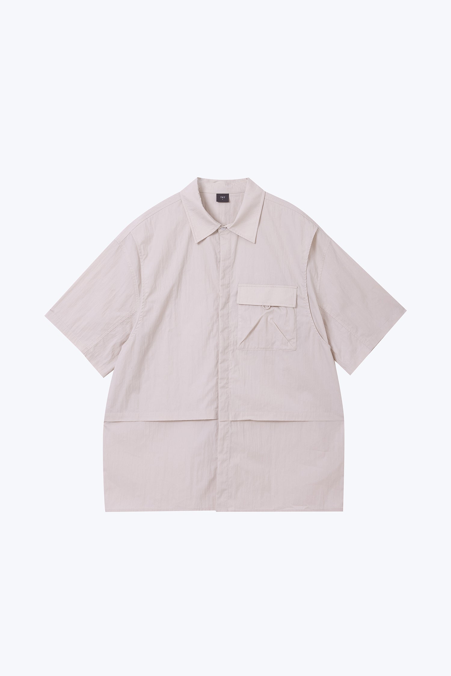 Designed with a vest-style front, this shirt blends structured detailing and casual comfort. Crafted from lightweight fabric, it features a flap pocket and layered panel construction for a distinctive utility-inspired look.