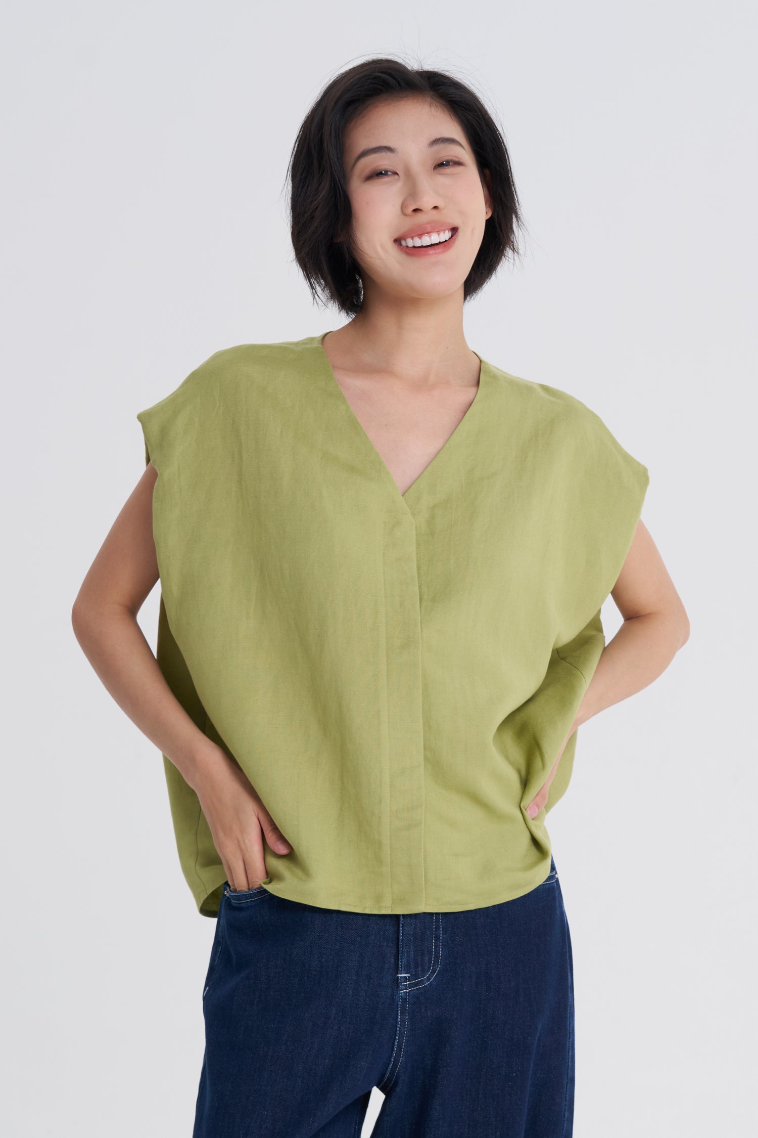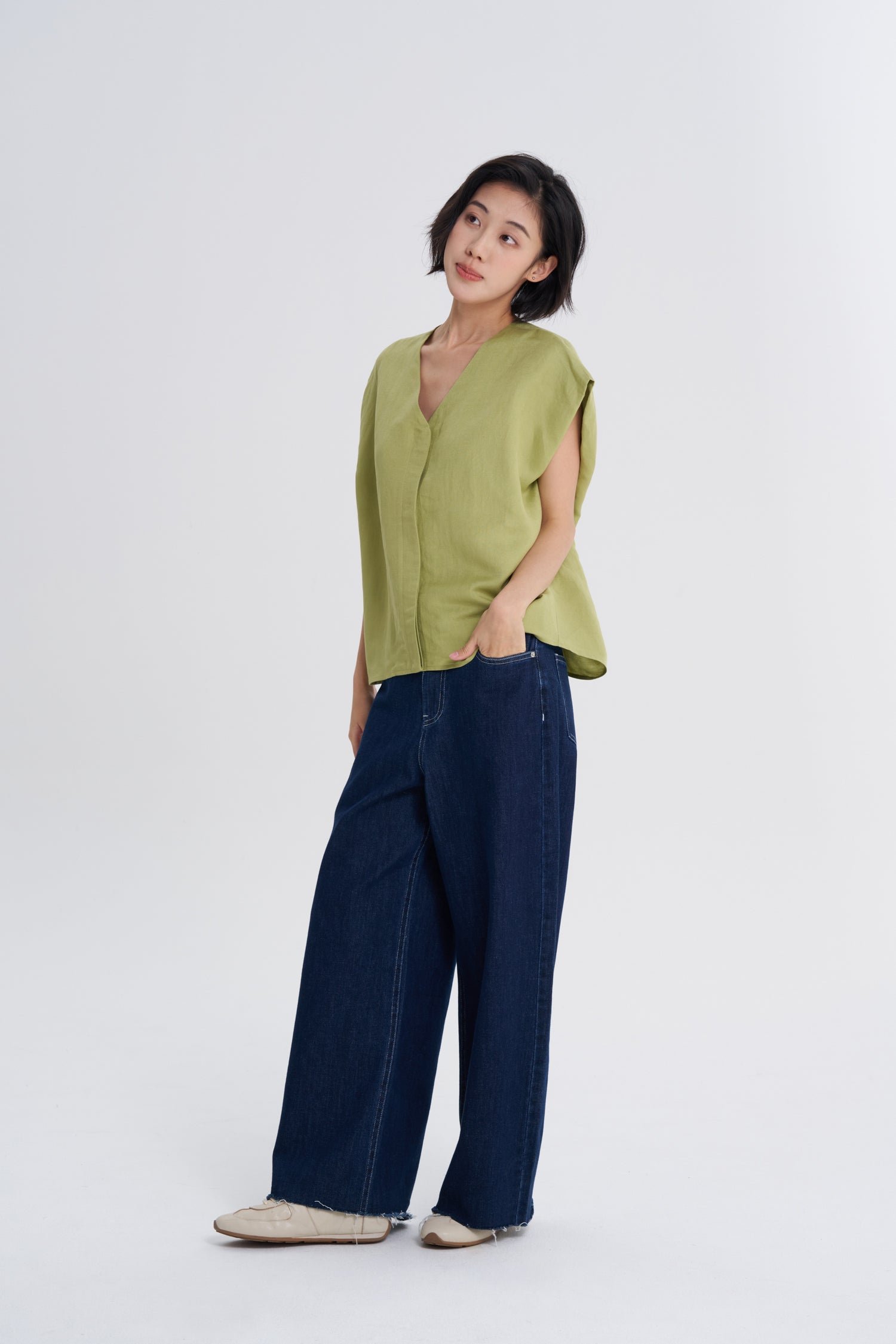 Effortless style meets everyday comfort in this minimalist V-neck blouse. The clean lines and precise, flattering neckline create a modern, versatile silhouette that works for any occasion. Crafted from breathable cotton-linen, it’s your perfect go-to for busy days, easily pairing with everything from your favorite jeans to tailored trousers for a look that’s both polished and perfectly uncomplicated.